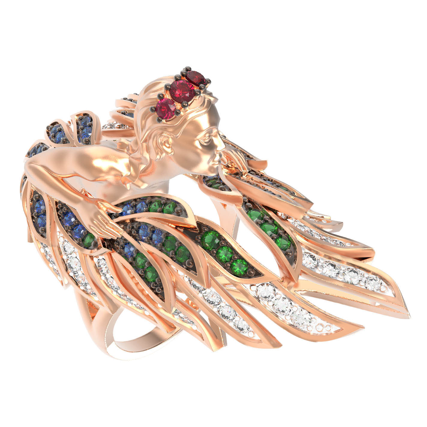 Особую выразительность изделию придает богатая палитра вставок. Всего в кольце использовано 137 фианитов круглой формы, которые переливаются разными оттенками, создавая эффект сказочного сияния. Красный цвет вставок в сочетании с переливами других тонов на крыльях подчеркивает глубину и сложность ювелирной работы. Красное золото, из которого изготовлен каркас, идеально гармонирует с сиянием камней, создавая завершенный и благородный образ.