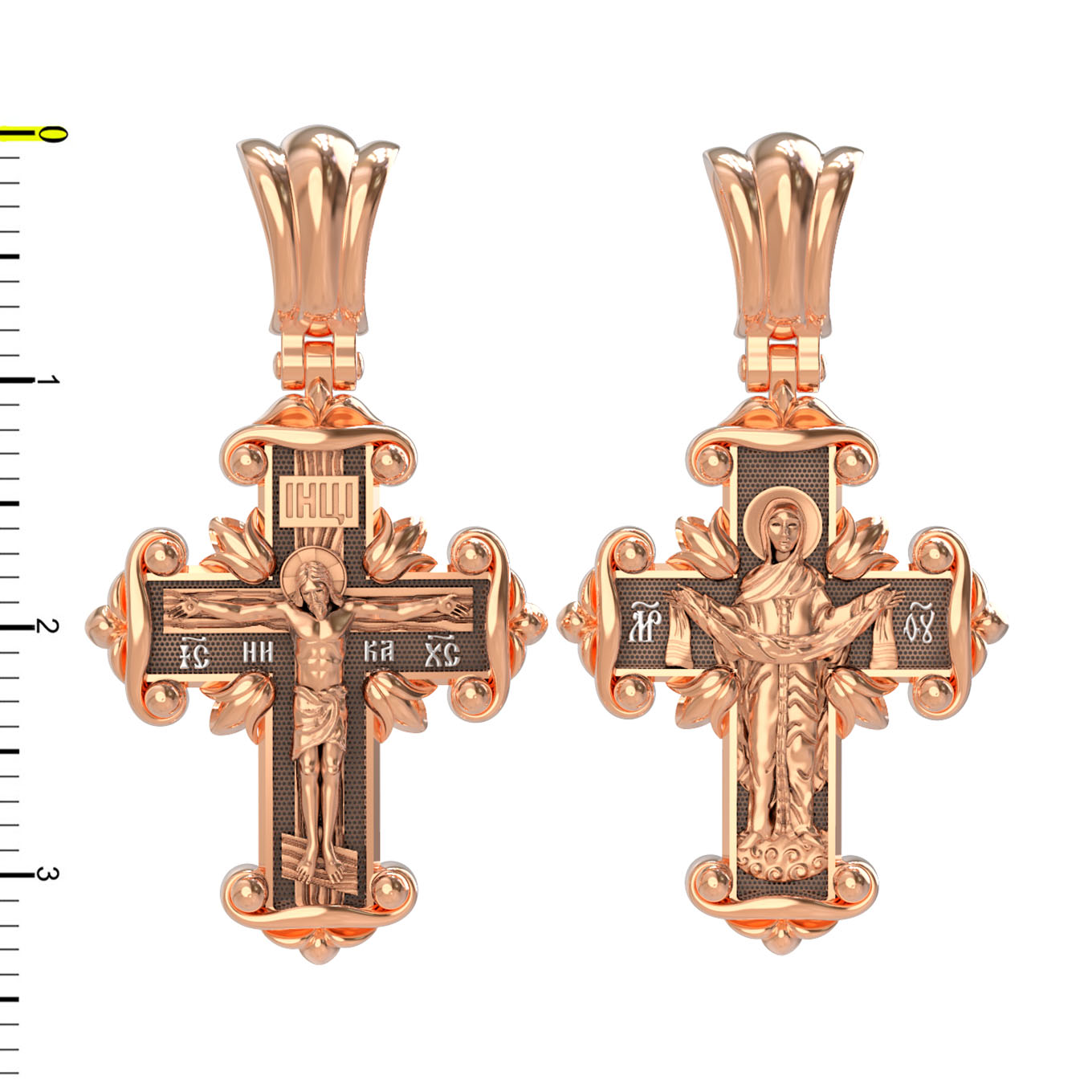 На лицевой стороне креста изображено Распятие Господа и Спасителя нашего Иисуса Христа, отдавшего Себя на смерть, для искупления грехов мира. Крест является символом жертвенной любви Всеблагого Бога к падшим людям, всепобеждающим духовным оружием христиан, основанием и средоточием церковной жизни. Господь сказал: кто хочет идти за Мною, отвергнись себя, и возьми крест свой, и следуй за Мною. (Мк. 8: 34). На верхней табличке, выше головы Иисуса, расположена надпись, составленная Понтием Пилатом — «IНЦI». Она означает «Иисус Назорей, Царь Иудейский». Надпись «IC» «ХC», означает Иисус Христос, помещается на разных сторонах поперечной перекладины креста. Рядом — слово «НИКА», что означает «победитель». На православном кресте Христос не умирает, а свободно простирает руки, ладони Иисуса открыты, будто он хочет обнять все человечество, даря им свою любовь и открывая путь к вечной жизни.
