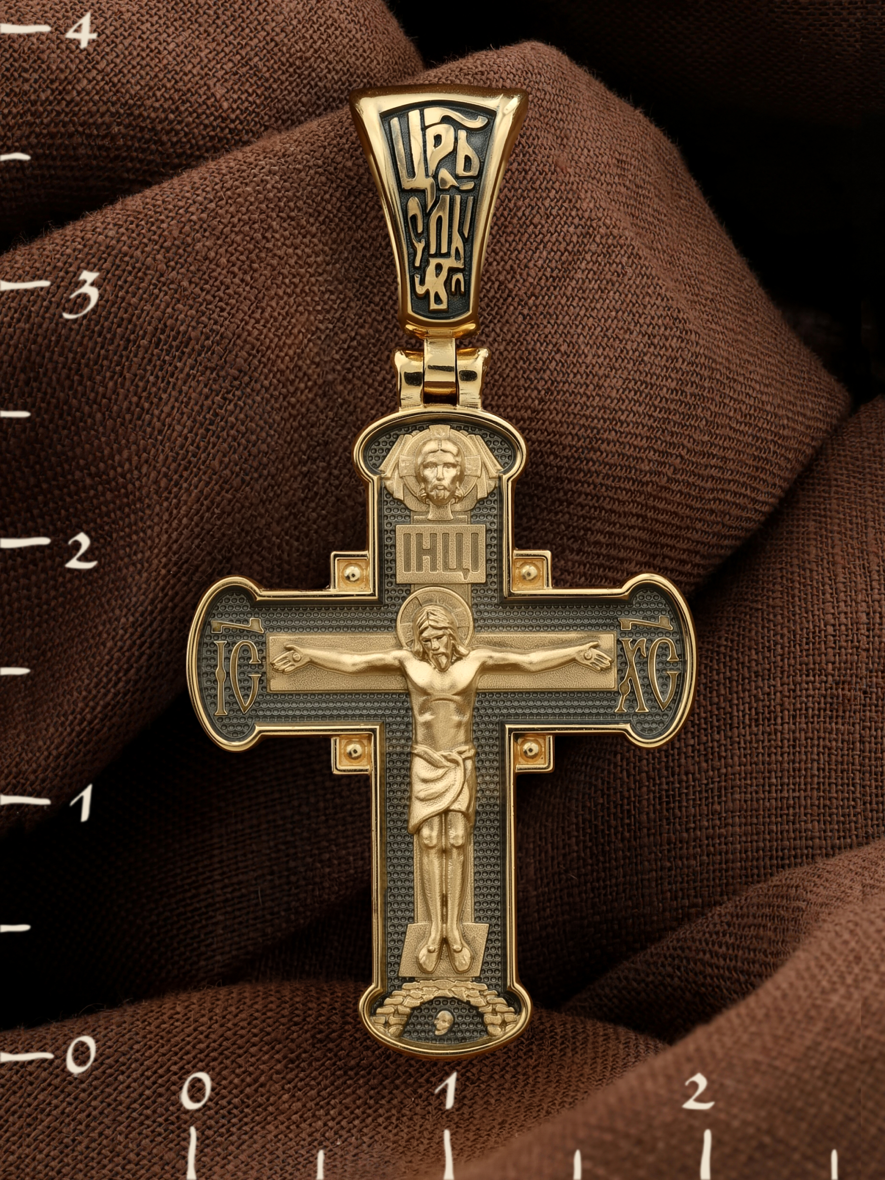 На лицевой стороне креста изображено Распятие Господа и Спасителя нашего Иисуса Христа, отдавшего Себя на смерть, для искупления грехов мира. Крест является символом жертвенной любви Всеблагого Бога к падшим людям, всепобеждающим духовным оружием христиан, основанием и средоточием церковной жизни. Господь сказал: «кто хочет идти за Мною, отвергнись себя, и возьми крест свой, и следуй за Мною». (Мк. 8: 34). На кулонном кольце помещена надпись «Царь Славы». На верхней табличке, выше головы Иисуса, расположена надпись, составленная Понтием Пилатом — «IНЦI». Она означает «Иисус Назорей, Царь Иудейский». Над ней — Нерукотворный образ Господа и Спасителя нашего Иисуса Христа, чудесно отпечатавшийся на плате, котором Христос вытер свой лик. Надпись «IC» «ХC», означает Иисус Христос, помещается на разных сторонах поперечной перекладины креста. Крест стоит на горе камней, символизирующих Голгофу. В ее основании различается череп– это голова Адама.