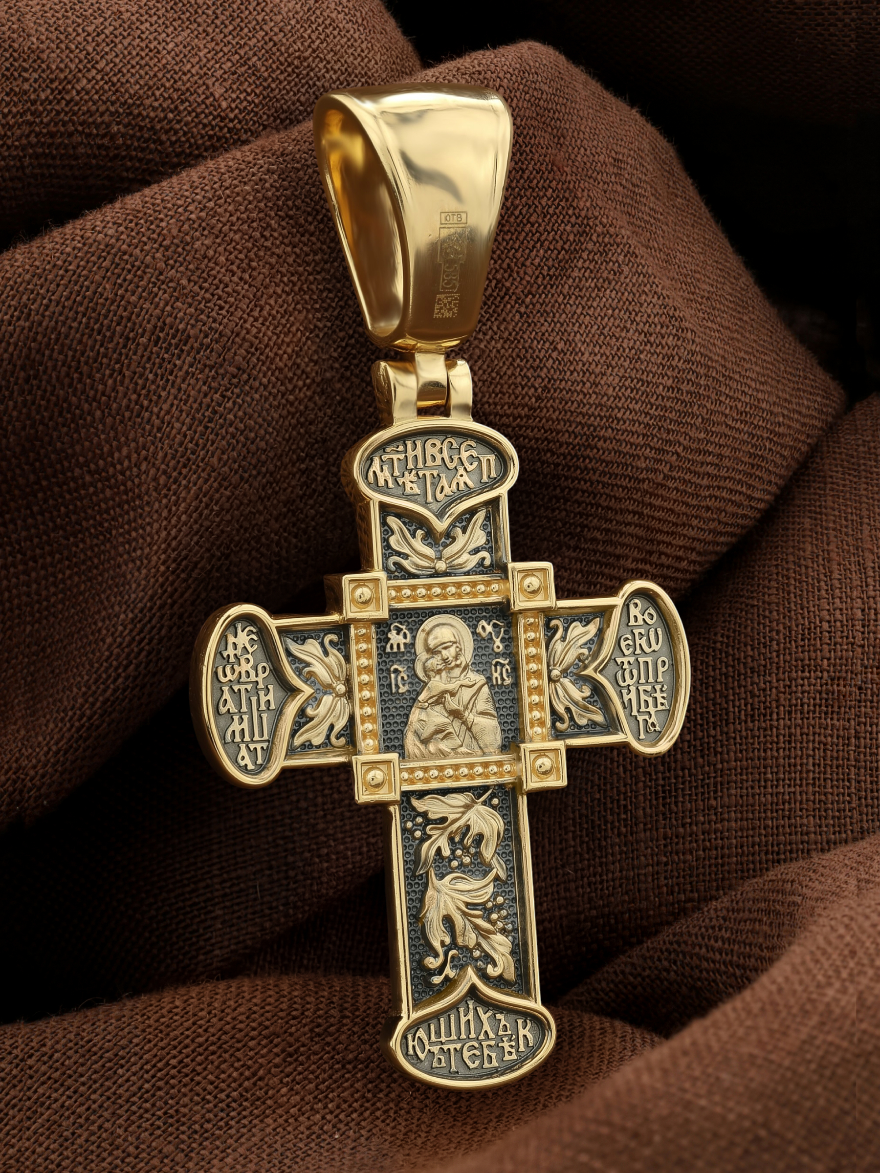 В центре оборотной стороне креста помещен образ Владимирской иконы Божией Матери — один из самых чтимых святынь Русской православной церкви. По преданию, икона была написана Святым апостолом и евангелистом Лукой во время земной жизни Богородицы. Дева Мария, увидев Свое изображение, молвила: «Отныне ублажат Мя вси роди. Благодать Рождшегося от Меня и Моя с сим образом да будет». Образ написан в лирическом иконографическом типе «Умиление». Младенец припал щекой к щеке Матери и тянется к ней правой рукой, другой нежно обнимая за шею. Икона Владимирской Божией Матери вплоть до V века находилась в Иерусалиме, затем была перевезена в Византию. На Русь икона была привезена в 1131 г. За прошедшие столетия святыня неоднократно переезжала из Владимира в Москву и обратно, не раз спасая страну от захватчиков. Русская Православная Церковь установила троекратное празднование Владимирской иконе Божией Матери. Каждый из дней празднования связан с избавлением русского народа от порабощения иноплеменниками по молитвам ко Пресвятой Богородице. В последующие века у иконы происходили многие важные исторические события: подписание актов, принятие присяги значимых государственных деятелей и возведение на престол. Вокруг образа, по сторонам Креста, написана молитва: «Мати Всепетая, не отврати лица Твоего от прибегающих к Тебе». Оборотная сторона креста украшена растительным орнаментом.