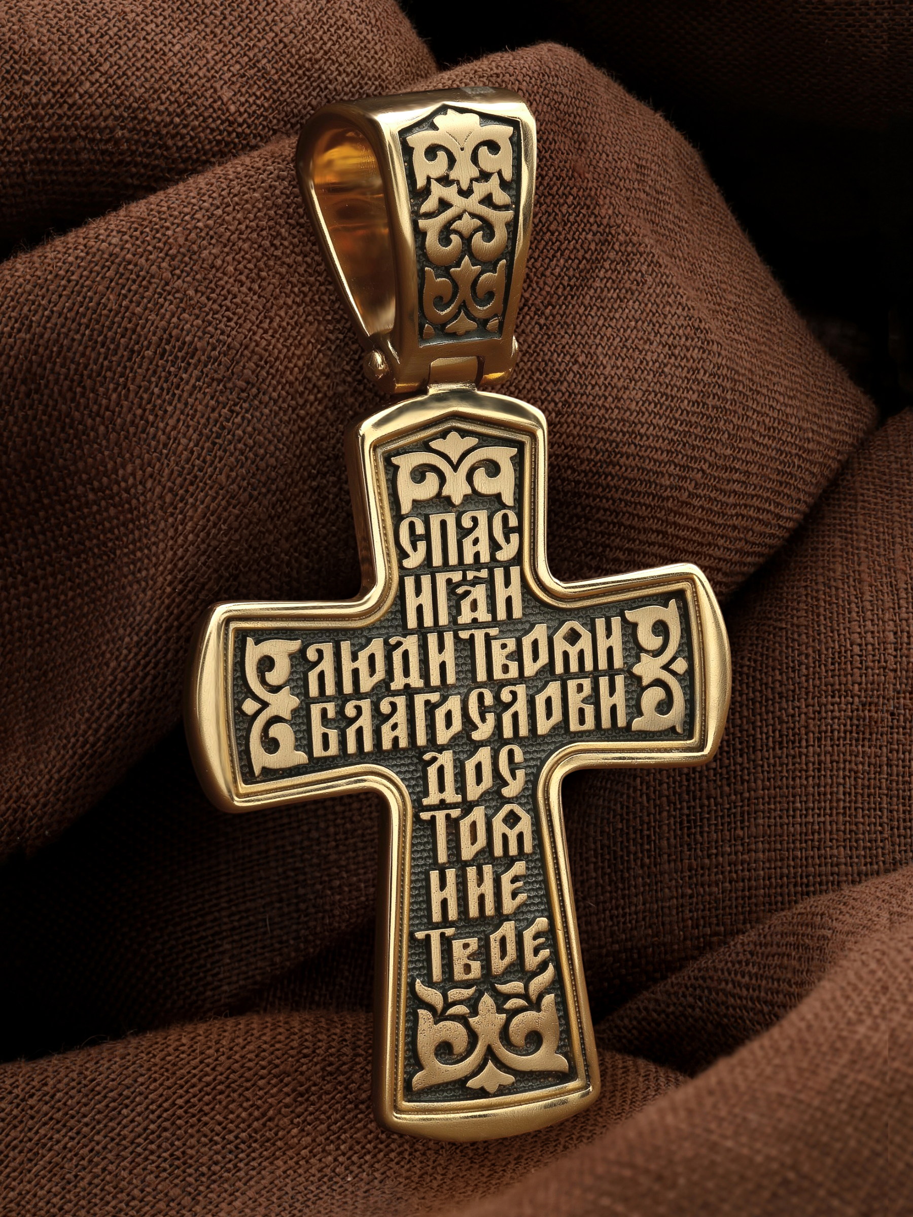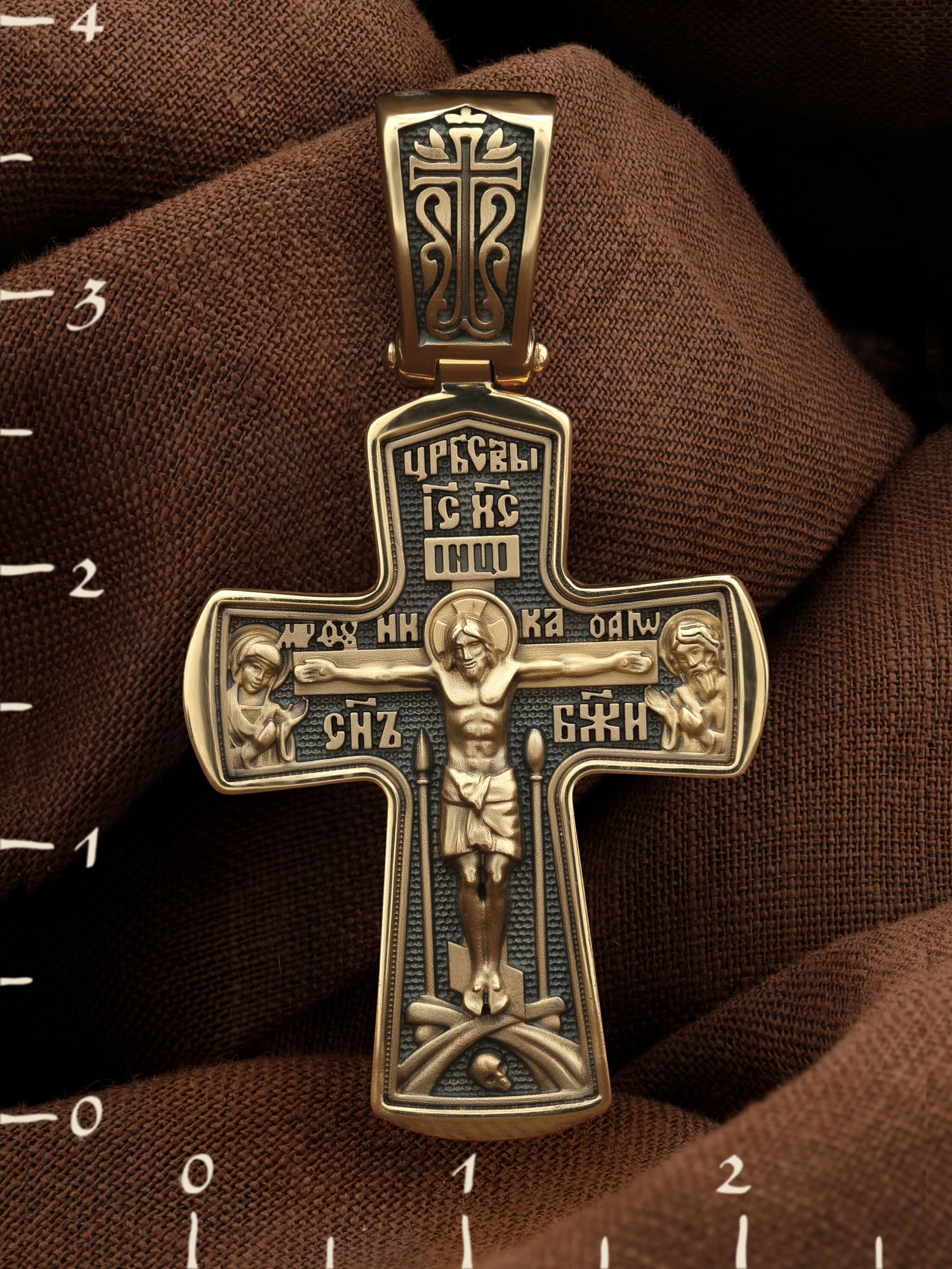 На лицевой стороне креста изображено Распятие Господа и Спасителя нашего Иисуса Христа, отдавшего Себя на смерть, для искупления грехов мира. Крест является символом жертвенной любви Всеблагого Бога к падшим людям, всепобеждающим духовным оружием христиан, основанием и средоточием церковной жизни. Господь сказал: «кто хочет идти за Мною, отвергнись себя, и возьми крест свой, и следуй за Мною». (Мк. 8: 34). На кулонном кольце изображен процветший крест. На верхней табличке, выше головы Иисуса, расположена надпись, составленная Понтием Пилатом — «IНЦI». Она означает «Иисус Назорей, Царь Иудейский». Распятие сопровождается каноническими надписями. Выше Распятия помещена надпись «Царь Славы» и надпись «IC» «ХC», означает Иисус Христос. Слово «НИКА», что означает «победитель» и надпись «Сын Божий», что означает божественную природу Иисуса Христа, помещаются на разных сторонах поперечной перекладины креста. Слева от Распятия изображена Пресвятая Богородица, справа — Про¬рок Предтеча и Креститель Господень Иоанн. Вдоль креста помещены Орудия Страстей Господних — копие сотника Лонгина и трость с губкой. Крест стоит на горе камней, символизирующих Голгофу. В ее основании различается череп– это голова Адама. На православном кресте Христос не умирает, а свободно простирает руки, ладони Иисуса открыты, будто он хочет обнять все человечество, даря им свою любовь и открывая путь к вечной жизни.