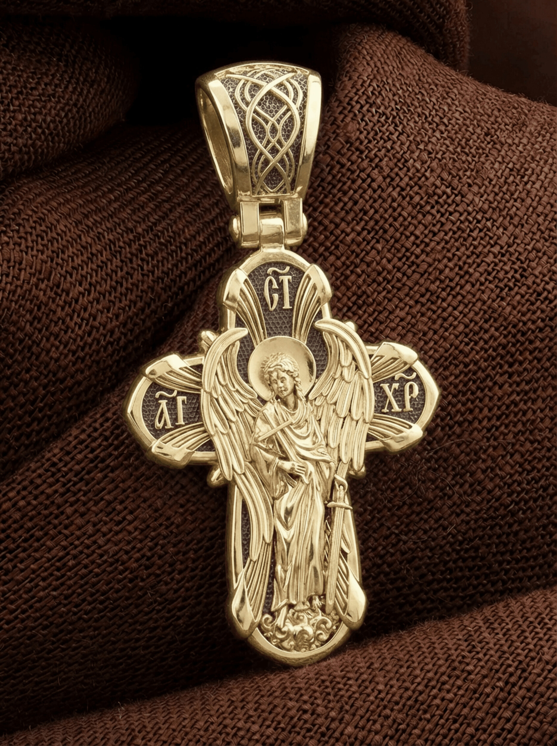 На оборотной стороне креста изображен Святой Ангел-Хранитель держащий в правой руке крест, а в левой — мечь.. Ангел-Хранитель — это Ангел приставляемый Богом к человеку при крещении для охраны и помощи в добрых делах. Он невидимо находится при человеке на протяжении всей его жизни, если человек сохраняет в себе любовь к Богу и истинную веру перед Ним. Ангел-Xранитель делают для нас все, что служит к истинному нашему благу и спасению. Невидимо пребывая при нас постоянно, он, руководствуя нас ко спасению, не только по нашему желанию таинственно наставляет нас на все доброе и полезное, не только возносит наши молитвы к Богу, но еще и сам от себя охраняют и защищают нас от врагов видимых и невидимых и ходатайствует за нас пред Богом. Ангел-Хранитель так любит нас, как никто на земле любить не может. Ангел-Хранитель — присный друг наш, незримый тихий собеседник, пресладостный утешитель. Одного лишь каждому из нас он желает — спасения души; к этому он направляет все свои заботы. И если видит нас также заботящимися о спасении, радуется, если же видит нас пребывающими в нерадении о душе своей, скорбит. Но и самый великий грешник может примириться со своим Ангелом-Хранителем посредством искреннего раскаяния в грехах и оставления их навсегда. В таком случае, по слову Писания, великая радость бывает для всех ангелов на небесах (Лк. 15:10).