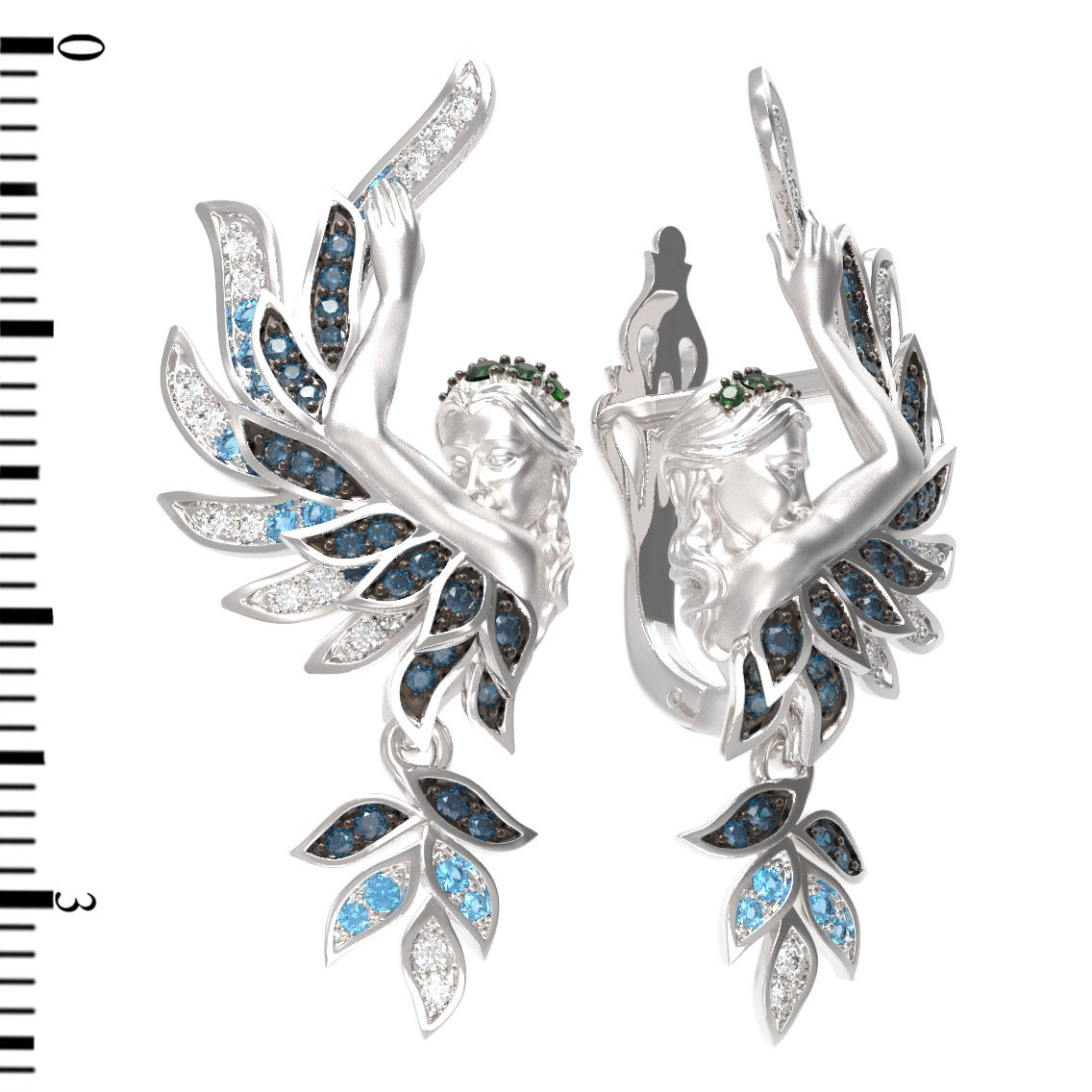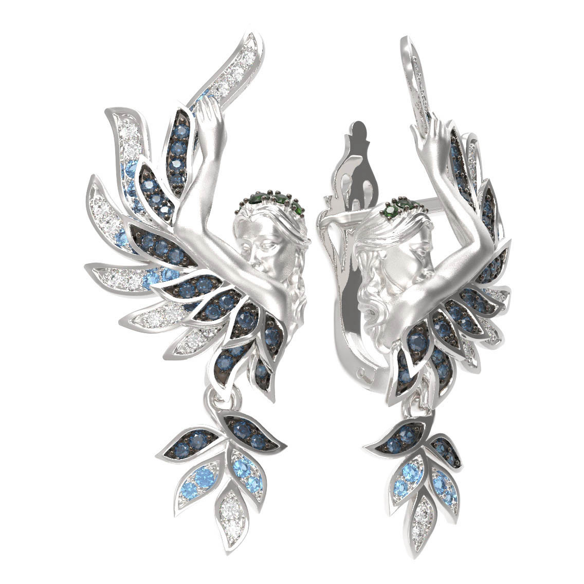Акцентным элементом украшения стали 120 вставок из фианита, которые мастерски расположены для создания глубокого визуального эффекта. Особую выразительность композиции придают зеленые вставки круглой формы, расположенные в верхней части, подчеркивая тематический дизайн. Такое сочетание материалов и оттенков делает серьги по-настоящему уникальными.
