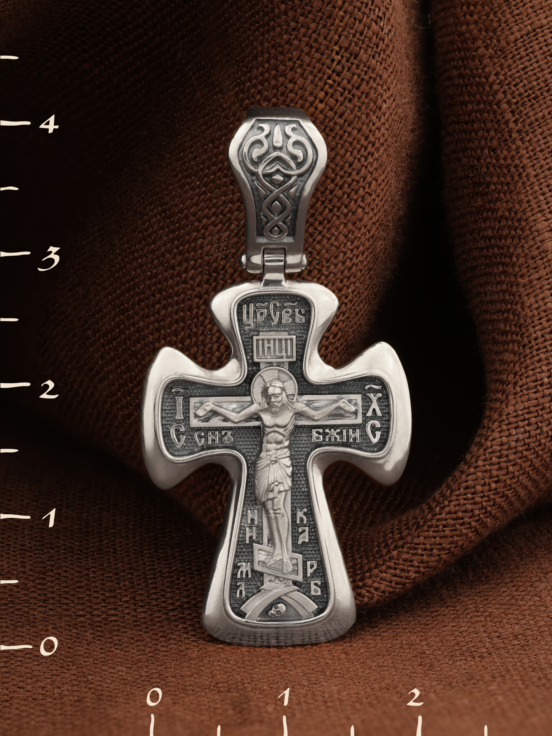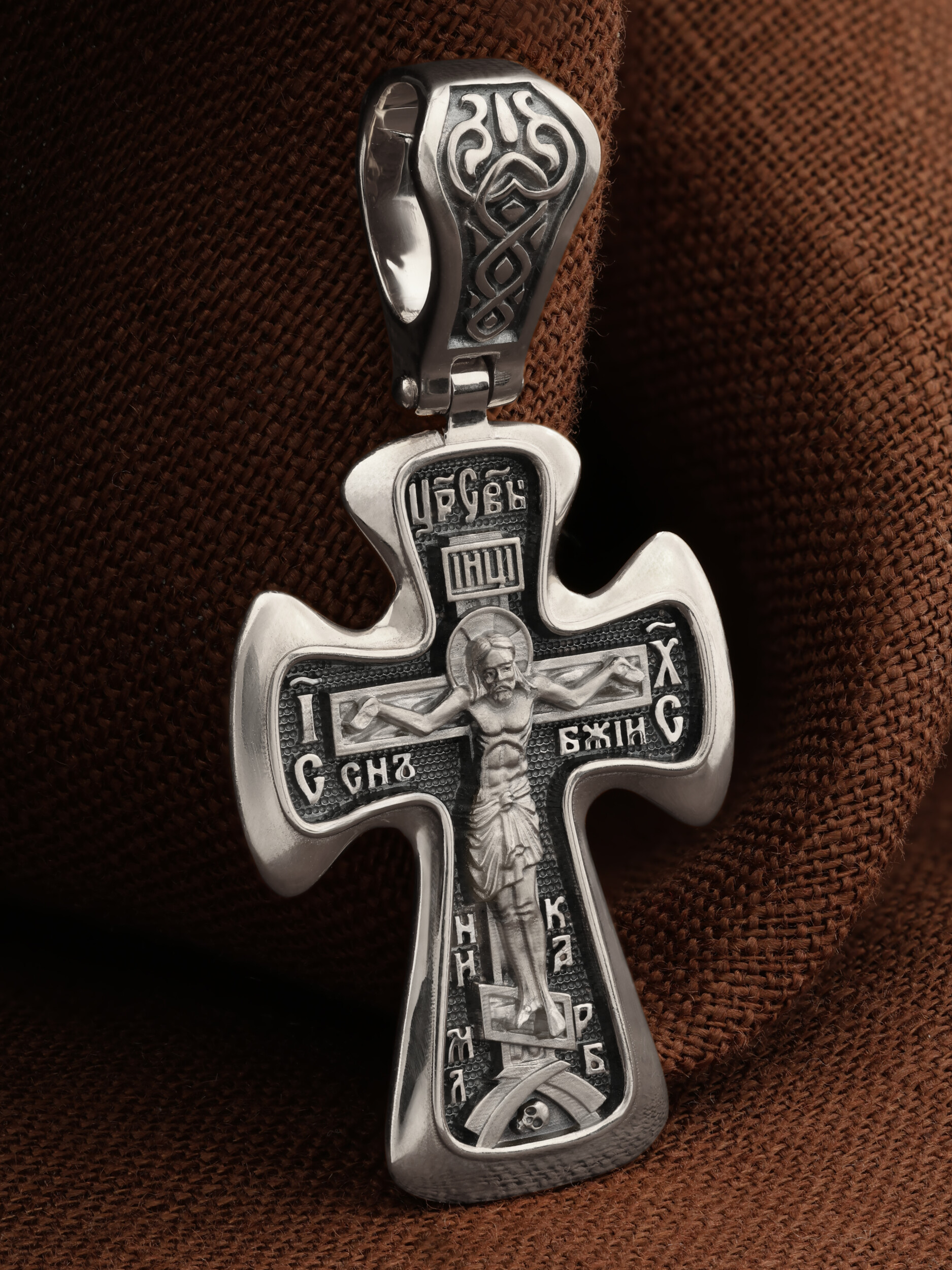 На лицевой стороне креста изображено Распятие Иисуса Христа. Господь представлен свободно покоящимся на кресте с простертыми руками и как бы обнимающим всю Вселенную. Он — Спаситель, искупивший грехи мира, «поправший смертию смерть» и призывающий к Себе «все концы земли». Поэтому рядом с Его образом помещены слова — «НИКА» и «Царь Славы». Эти слова характеризуют Господа как Великого Архиерея, победителя смерти. Также Распятие сопровождается надписями, олицетворяющими Христа. Это святое имя Христа «IC» (Иисус) «ХС» (Христос), и словосочетание «СЫН БОЖИЙ».