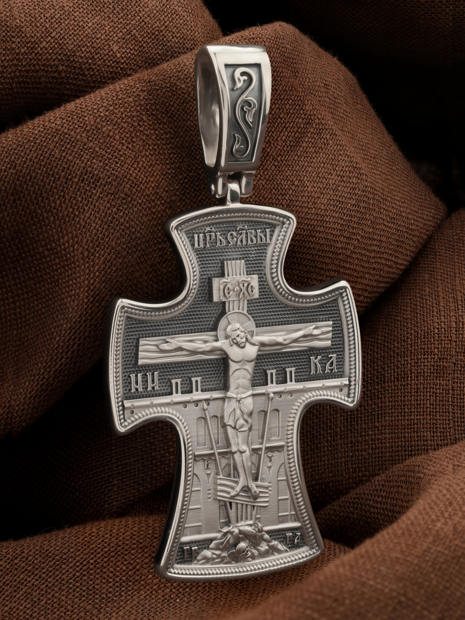 Основное поле лицевой стороны креста занято рельефным изображением Распятия Христова на восьмиконечном Голгофском Кресте. Позади Распятия видна иерусалимская стена, знак того, что Господь был распят вне стен города. Но вместе с тем стена символизирует и Небесный Иерусалим, путь который открылся для человека через Голгофу. У подножья Господа в виде скалистой горки видна сама Голгофа с Главой Адамовой в пещере. По сторонам Голгофы начертаны буквы «ГГ» (Гора Голгофа) и «ГА» (голова Адама). Справа и слева от Креста изображены орудия страданий Господа — трость и копие, обозначенные буквами «Т» и «К». На трости стражники подали Христу пропитанную уксусом губку, когда Он жаждал воды, а копьем пронзили Ему ребра, чтобы проверить: умер ли Он?