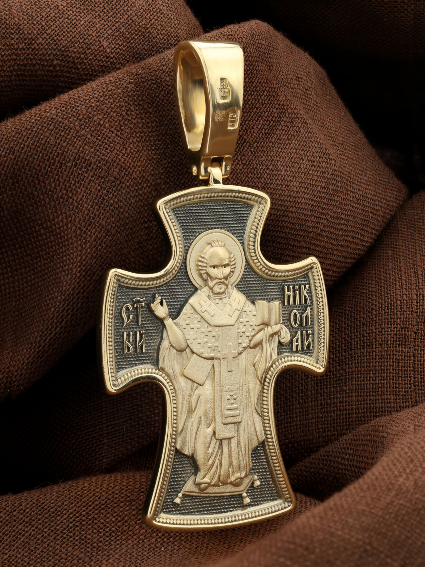 Оборотную сторону креста возглавляет икона святителя Николая Чудотворца. Живший в III веке епископ Ликийского города Миры — самый почитаемый святой не только в России, но и во всем мире. Николай Чудотворец, помощник в делах, защитник путешествующих, покровитель учащихся, утешитель обиженных и нуждающихся, целитель самых страшных и тяжелых недугов, предстатель и молитвенник за людей перед Богом.