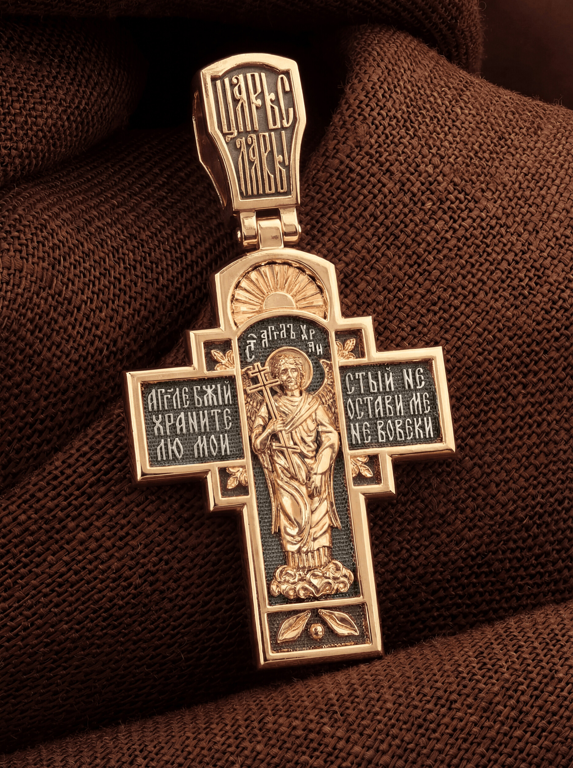 Оборотную сторону креста возглавляет Ангел Хранитель с крестом: им он защищает человека от злых духовных и физических нападений. Ангел не может нарушить свободу воли человека, поэтому его надо молитвенно просить о помощи: «Ангеле Божий, хранителю мой святый, не остави мене вовеки», — эта молитва написана вокруг его образа.