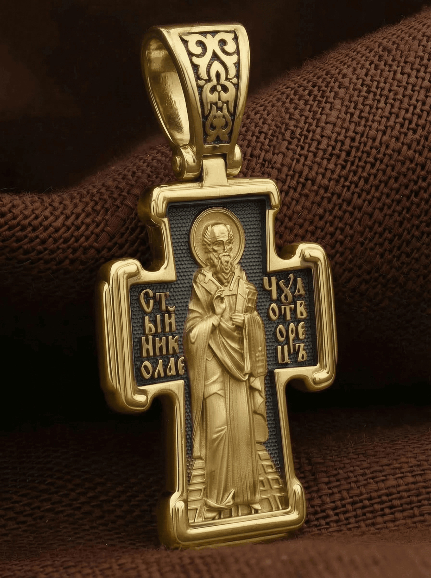 На оборотной стороне креста изображен святитель Николай архиепископ Мир Ликийских, Чудотворец. Он является одним из самых почитаемых святых в православном мире. Святитель Николай родился во второй половине III века в Малой Азии в Ликийском городе Патары. С рождения Божий Угодник проявлял необыкновенные дарования. Сохранилось Предание, что во время крещения он, никем не поддерживаемый, простоял в купели три часа. С детства святитель избегал пустых развлечений, любил молитву, прекрасно учился и проводил свободное время за чтением Священного писания. Приняв сан священника, святитель Николай стал проводить еще более строгую подвижническую жизнь. Вся жизнь святого Николая — это служение Богу. Много великих и преславных чудес сотворил на земле и на море великий Святитель Николай Угодник. Он помогал сущим в бедах, укрощал штормы, спасал от потопления и выносил на сушу из глубины морской, освобождал из плена и приносил освобожденных домой, избавлял от уз и темницы, защищал от посечения мечом, освобождал от смерти и подавал многим различные исцеления, слепым прозрение, хромым хождение, глухим слух, немым дар слова.