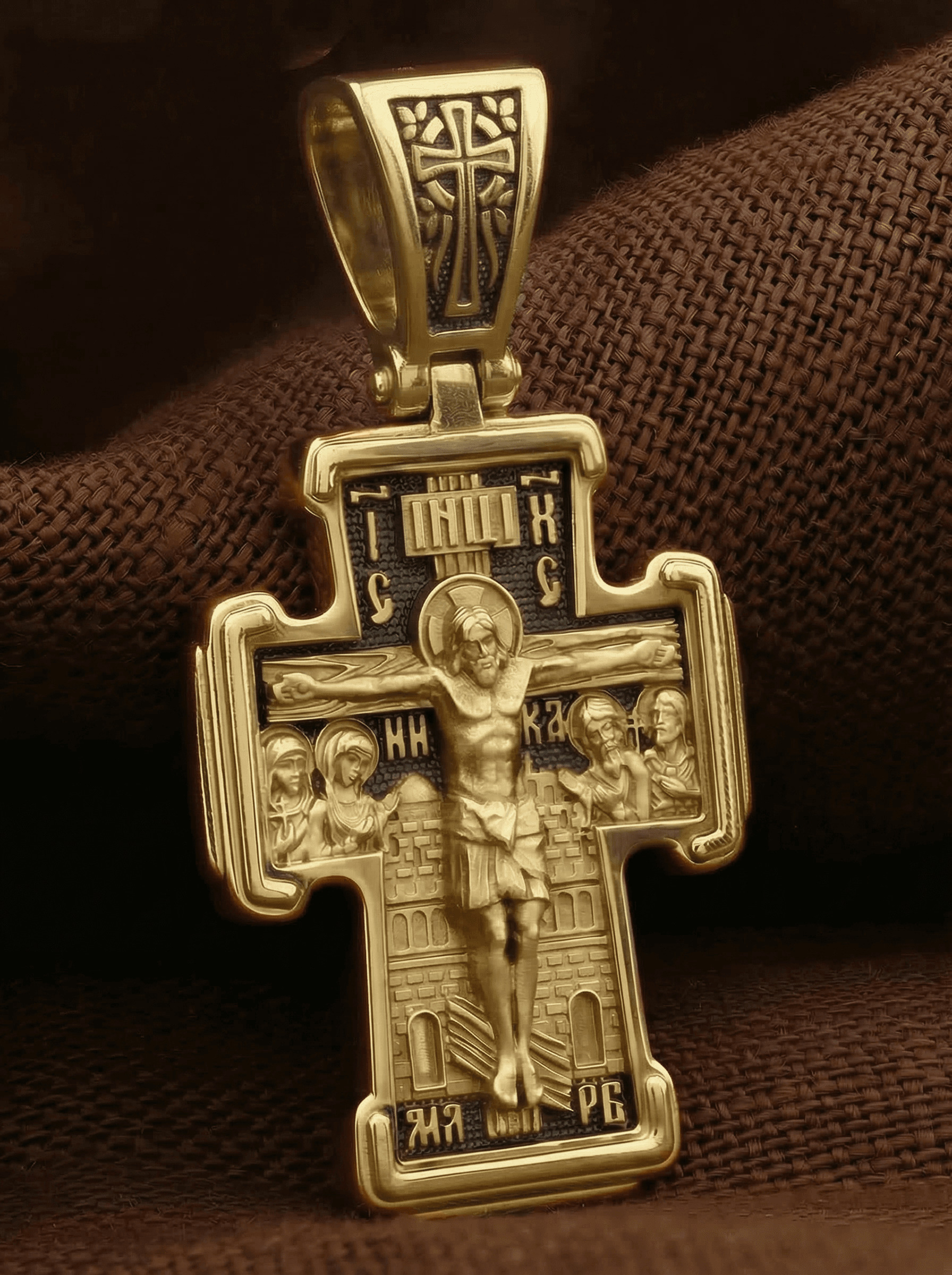 На лицевой стороне креста изображено Распятие Господа и Спасителя нашего Иисуса Христа. Крест- символ спасения и искупления рода человеческого, знамение победы над смертью и адом. Иисус Христос, как искупительная жертва освобождения человечества от власти греха, умер крестной смертью и в третий день воскрес. На верхней табличке, выше головы Иисуса, расположена надпись, составленная Понтием Пилатом — «IНЦI». Она означает «Иисус Назорей, Царь Иудейский». Рядом расположена надпись «IС» « ХС». Она означает Иисус Христос. Ниже — слово «НИКА», что означает «победитель». Слева от Распятия — Пресвятая Богородица и святая мироносица Мария Магдалина с крестом в руке. Справа — апостол и евангелист Иоанн Богослов, один из ближайших учеников Иисуса Христа, и сотник Лонгин с крестом в правой руке и копьем — в левой. За крестом высится Иерусалимская стена. Надпись «МЛРБ» — «место лобное рай бысть» означает, что место лобное стало раем, помещается в нижней части креста. На кулонном кольце помещен крест.