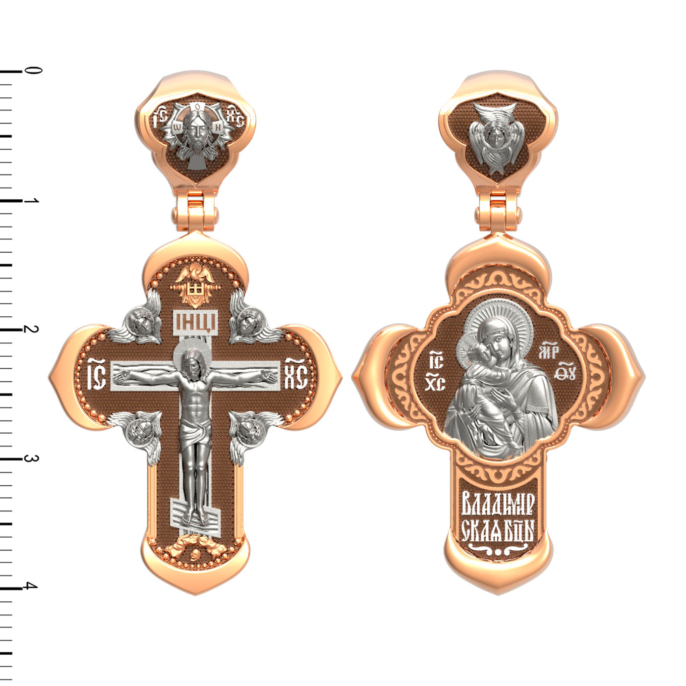 На лицевой стороне креста изображено Распятие Господа и Спасителя нашего Иисуса Христа, отдавшего Себя на смерть, для искупления грехов мира. Крест является символом жертвенной любви Всеблагого Бога к падшим людям, всепобеждающим духовным оружием христиан, основанием и средоточием церковной жизни. Господь сказал: «кто хочет идти за Мною, отвергнись себя, и возьми крест свой, и следуй за Мною». (Мк. 8: 34). На верхней табличке, выше головы Иисуса, расположена надпись, составленная Понтием Пилатом — «IНЦI». Она означает «Иисус Назорей, Царь Иудейский». Надпись «IC» «ХC», означает Иисус Христос, помещается на разных сторонах поперечной перекладины креста. Крест стоит на горе камней, символизирующих Голгофу. В ее основании различается череп– это голова Адама. На кулонном кольце изображен Нерукотворный образ Господа и Спасителя нашего Иисуса Христа, чудесно отпечатавшийся на плате, которым Христос вытер свой лик.
