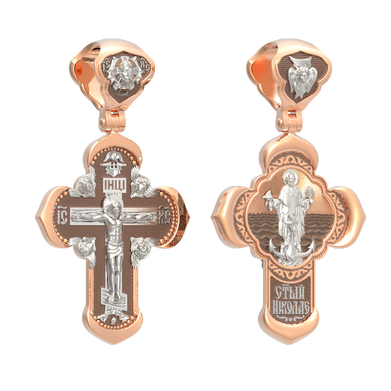 На лицевой стороне креста изображено Распятие Господа и Спасителя нашего Иисуса Христа, отдавшего Себя на смерть, для искупления грехов мира. Крест является символом жертвенной любви Всеблагого Бога к падшим людям, всепобеждающим духовным оружием христиан, основанием и средоточием церковной жизни. Господь сказал: «кто хочет идти за Мною, отвергнись себя, и возьми крест свой, и следуй за Мною». (Мк. 8: 34). На верхней табличке, выше головы Иисуса, расположена надпись, составленная Понтием Пилатом — «IНЦI». Она означает «Иисус Назорей, Царь Иудейский». Надпись «IC» «ХC», означает Иисус Христос, помещается на разных сторонах поперечной перекладины креста. Крест стоит на горе камней, символизирующих Голгофу. В ее основании различается череп– это голова Адама. На кулонном кольце изображен Нерукотворный образ Господа и Спасителя нашего Иисуса Христа, чудесно отпечатавшийся на плате, которым Христос вытер свой лик.