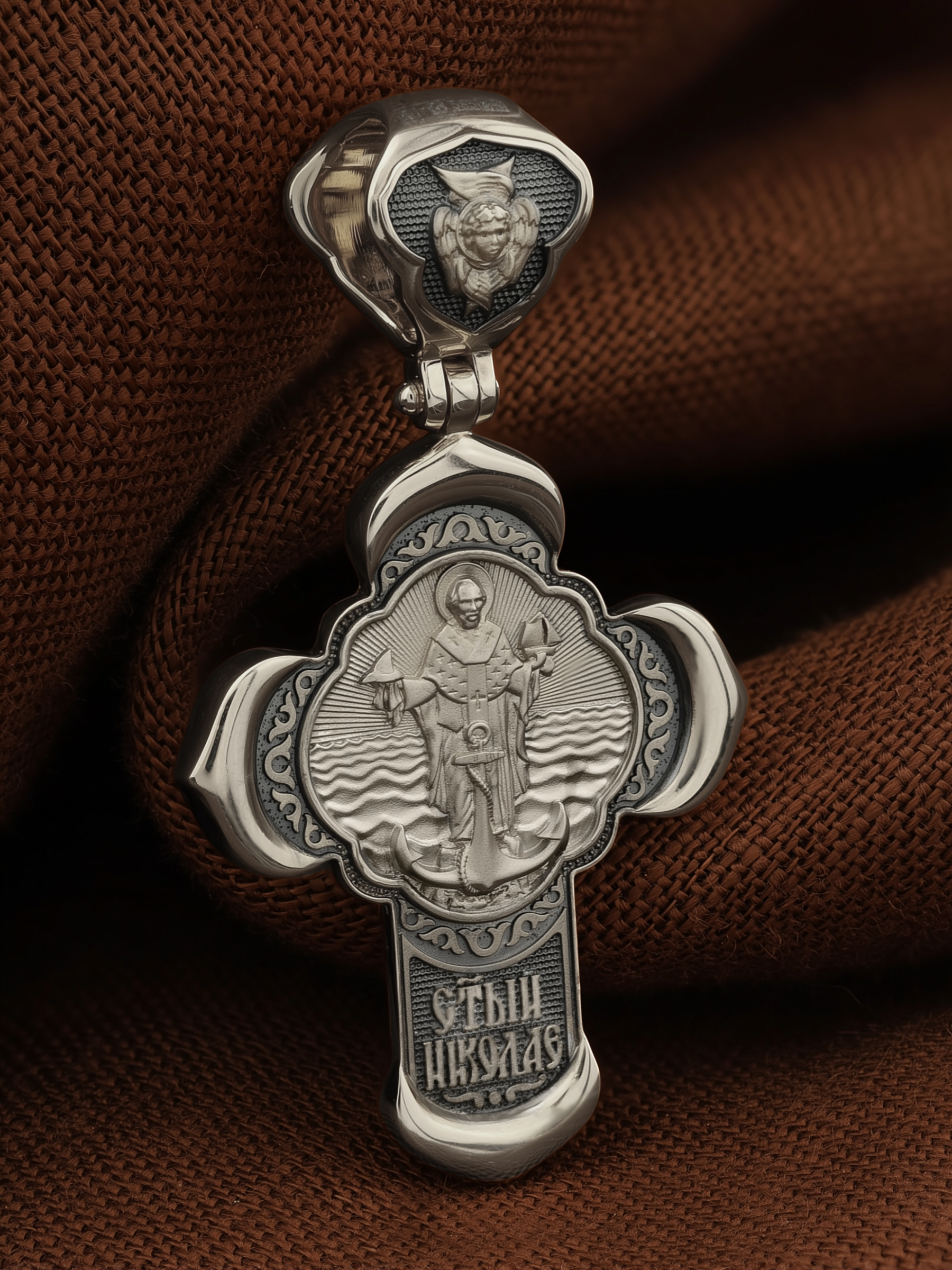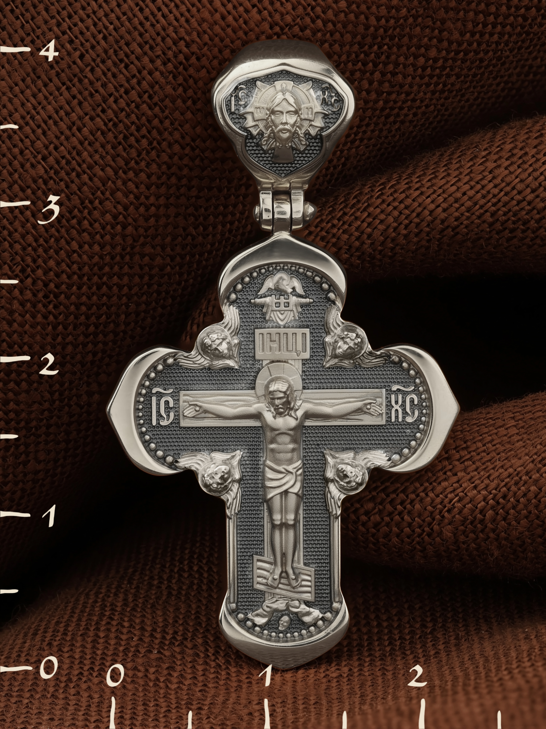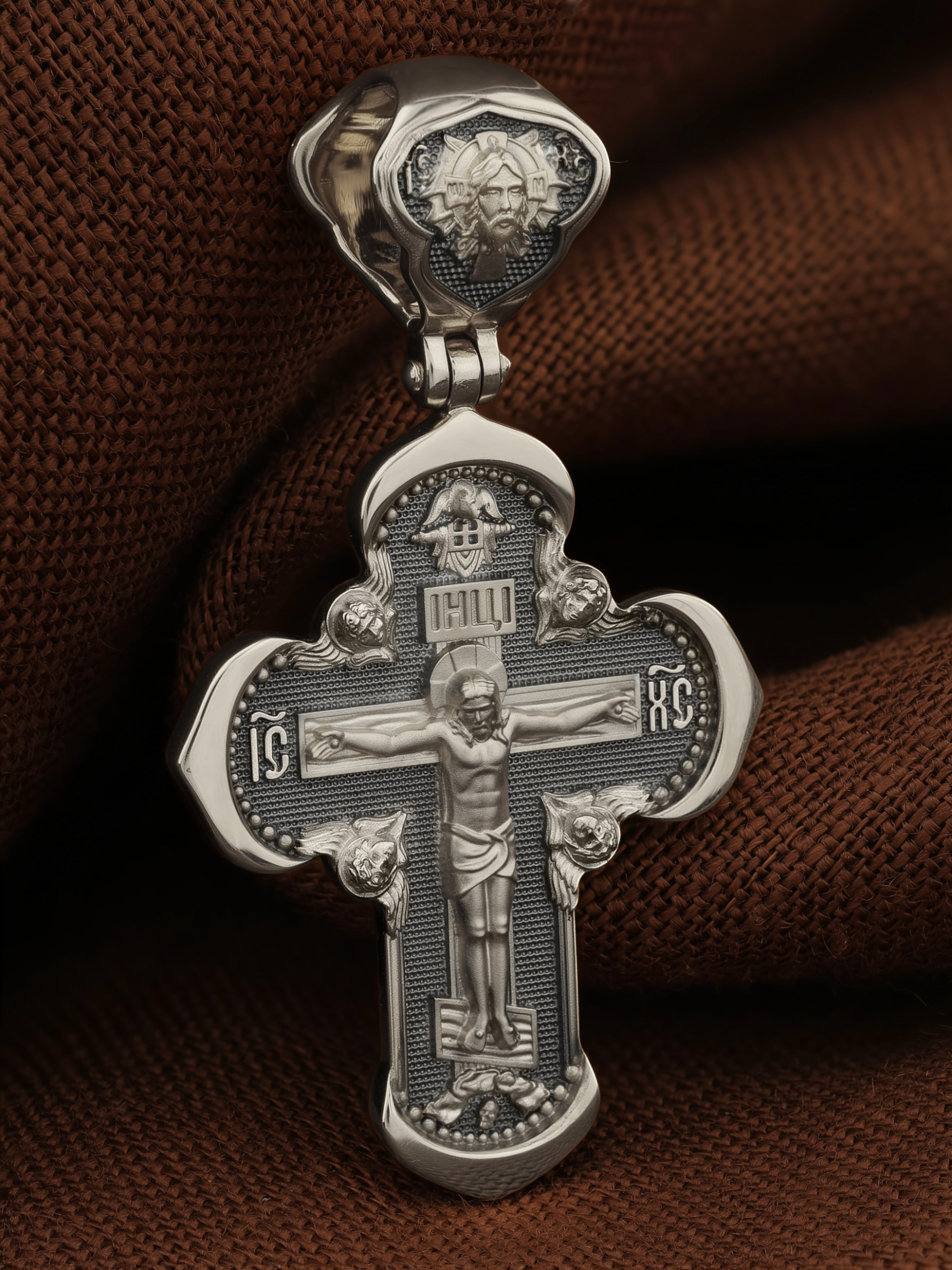На лицевой стороне креста изображено Распятие Господа и Спасителя нашего Иисуса Христа, отдавшего Себя на смерть, для искупления грехов мира. Крест является символом жертвенной любви Всеблагого Бога к падшим людям, всепобеждающим духовным оружием христиан, основанием и средоточием церковной жизни. Господь сказал: «кто хочет идти за Мною, отвергнись себя, и возьми крест свой, и следуй за Мною». (Мк. 8: 34). На верхней табличке, выше головы Иисуса, расположена надпись, составленная Понтием Пилатом — «IНЦI». Она означает «Иисус Назорей, Царь Иудейский». Надпись «IC» «ХC», означает Иисус Христос, помещается на разных сторонах поперечной перекладины креста. Крест стоит на горе камней, символизирующих Голгофу. В ее основании различается череп– это голова Адама. На кулонном кольце изображен Нерукотворный образ Господа и Спасителя нашего Иисуса Христа, чудесно отпечатавшийся на плате, которым Христос вытер свой лик.