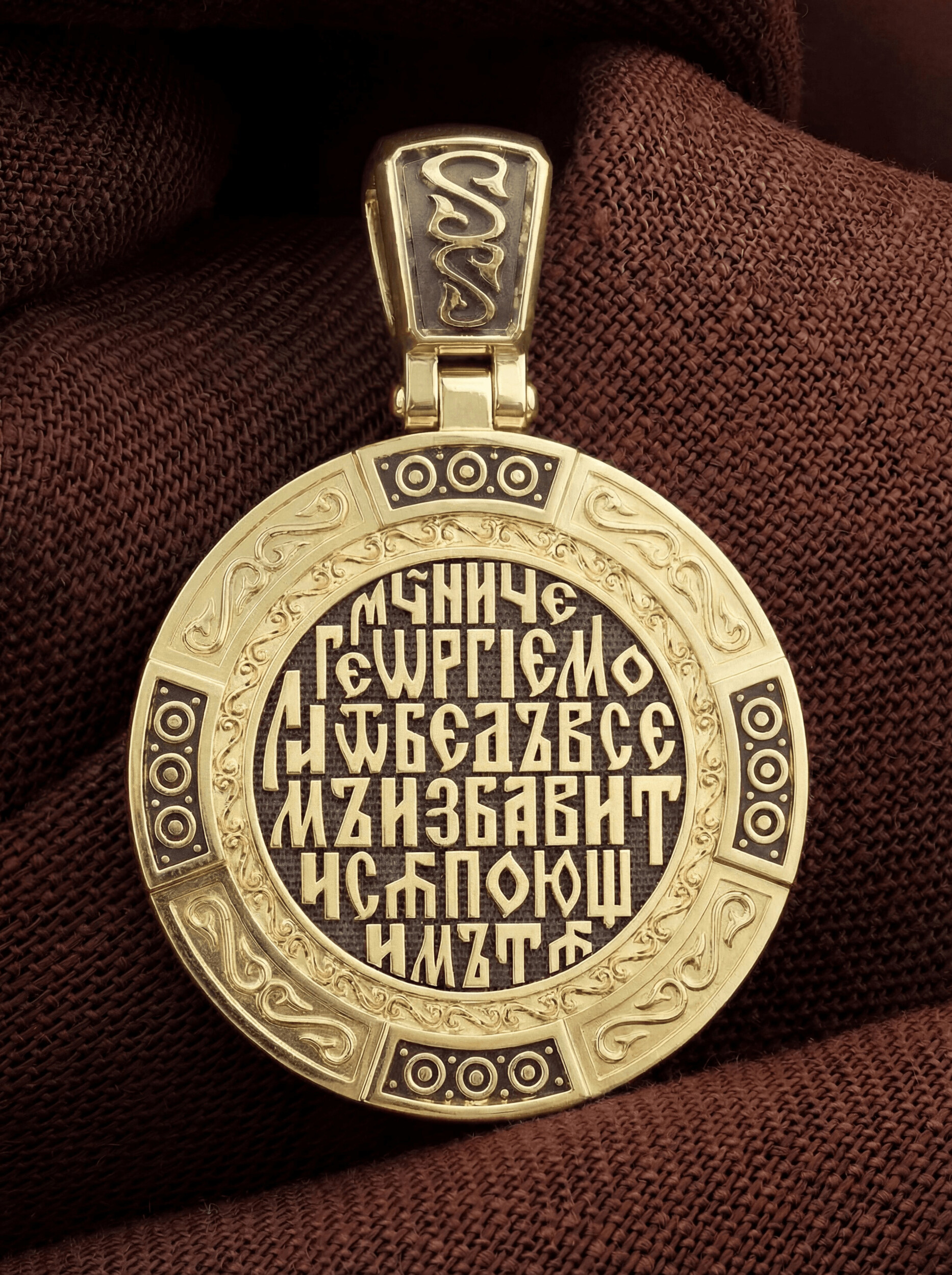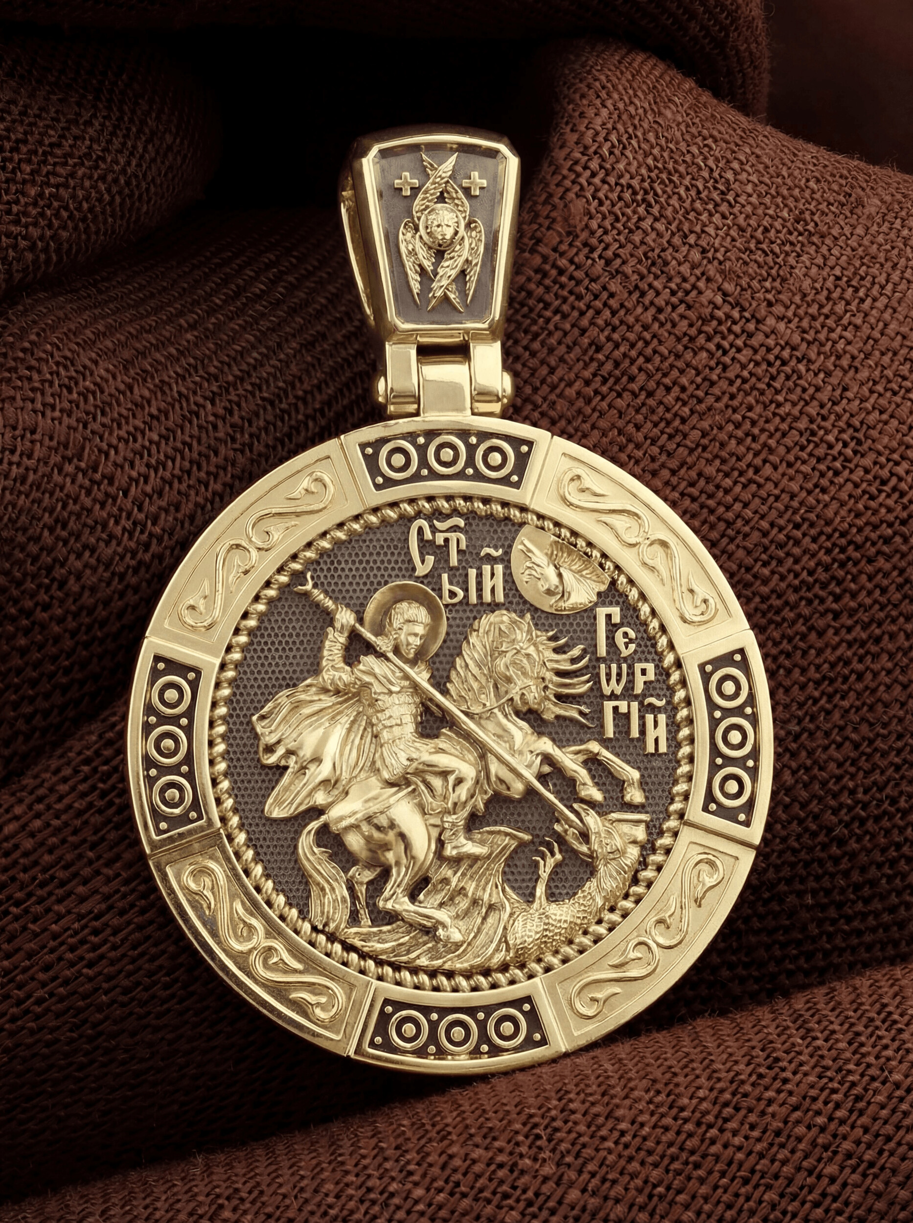На лицевой стороне изображен Святой Георгий Победоносец. Образ Великомученика считают одним из наиболее чтимых святынь в Святыни Православных, он олицетворяет собой заступника для верующих, чья жизнь имеет какое-либо отношение к военным делам, также он может оберегать и землевладельцев. Одно из самых великих чудес, которое сотворил Великомученик — это спасения всего города от устрашающего змия. Молитвами и своей непреклонной верой, взываемой к Всевышнему, он смог одолеть чудовище. Святой убил змея, спас жителей и их души от влияния дьявола, породив в них надежду и веру в Господа, призывая людей принять христианскую веру. Поскольку при жизни св. Георгий был военным, он считается покровителем всех, кто имеет отношение к армии — военнослужащим, участникам боевых действий. Молитва перед иконой Георгия Победоносца поможет защититься от врагов, одержать победу в сражении (военном, спортивном, духовной брани с дьяволом), содействие в установлении мира между членами семьи, избавиться от телесного недуга. На кулонном кольце изображен шестикрылый Серафим — самый приближенный к Господу Ангел.