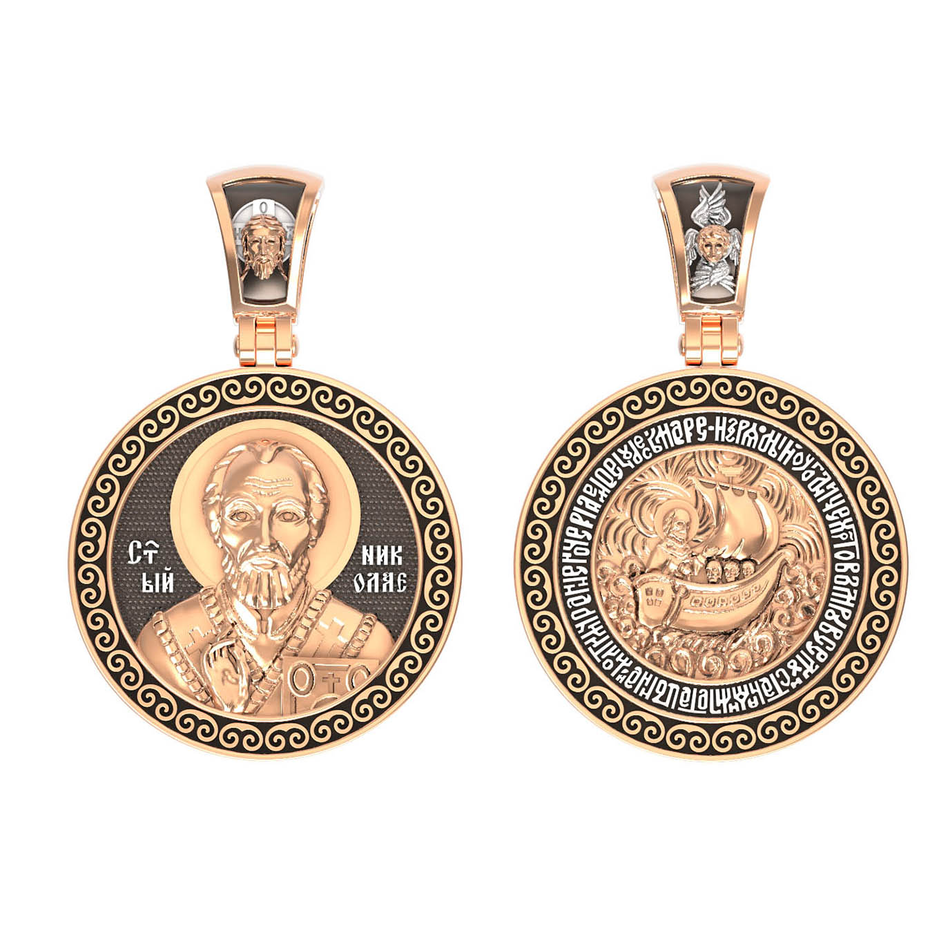 Лицевую сторону возглавляет икона Святителя Николая Чудотворца. Живший в III веке епископ Ликийского города Миры — самый почитаемый святой не только в России, но и во всем мире. Николай Чудотворец, помощник в делах, покровитель учащихся, утешитель обиженных и нуждающихся, целитель самых страшных и тяжелых недугов, предстатель и молитвенник за людей перед Богом. Также Святитель Николай Чудотворец известен своими молитвами за путешественников, когда непрестанный ветер и бушующие волны утихают и корабль заходит в спокойную гавань.