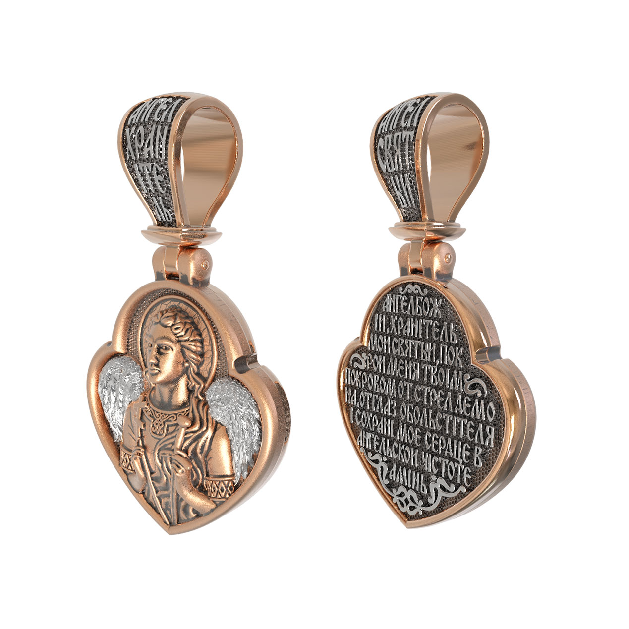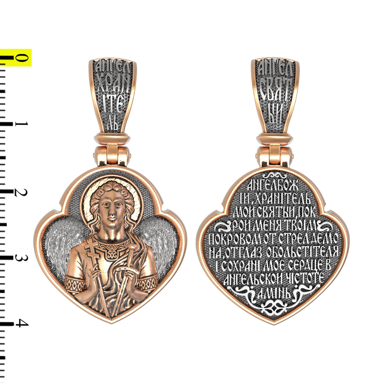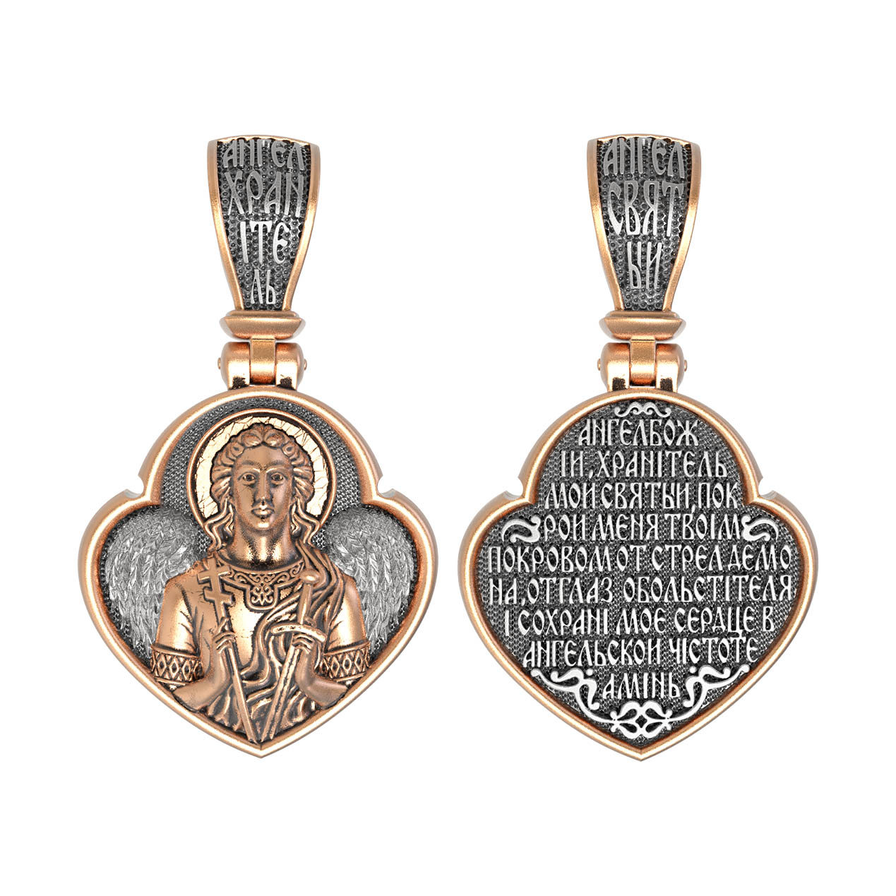 На оборотной стороне образка написана молитва: «Ангеле Божий, Хранитель мой Святый, покрой меня твоим покровом от стрел демона, от глаз обольстителя и сохрани мое сердце в ангельской чистоте. Аминь».