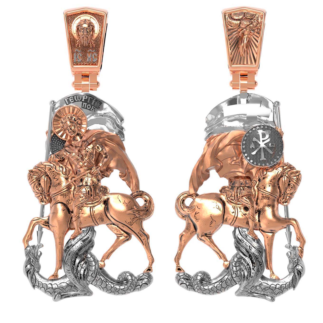 Основой композиции образка является изображение Святого Великомученика Георгия Победоносца — одного из самых почитаемых и удивительных святых. Георгий родился в Каппадокии (Малая Азия) в семье богатых и знатных горожан. Юношей поступил на службу к римскому императору Диоклетиану, за отличное знание военного дела и проявленную в боях и походах храбрость был приближен к императору и удостоен высокого воинского звания. Во время начавшихся гонений на христиан, перешел на сторону гонимых и, отвергнув человеческий страх, стал ярым проповедником учения Христа. Мучители подвергли опального воеводу жесточайшим восьмидневным пыткам и казнили его (обезглавили) в возрасте около тридцати лет в 303 году. На Руси он известен как Юрий или Егорий, заступник для верующих, чья жизнь имеет какое-либо отношение к военным делам, помощник в крестьянском труде. Образок сделан в виде воинского щита. На нем Георгий изображен как воитель, сидящий на вздыбленном коне и поражающий копьем огнедышащего змея. Справа над образом изображена благословляющая Божия десница. Змей символизирует собою сатанинские силы. Молитвами вознесенными к Всевышнему и своей непреклонной верой он смог одолеть чудовище. Святой убил змея, спас царскую дочь, принесенную в жертву, и жителей города, их души от влияния дьявола, породив в них надежду и веру в Господа, призывая людей принять христианскую веру. На оборотной стороне образка написана молитва: «Мучениче Георгие, моли Бога о мне».