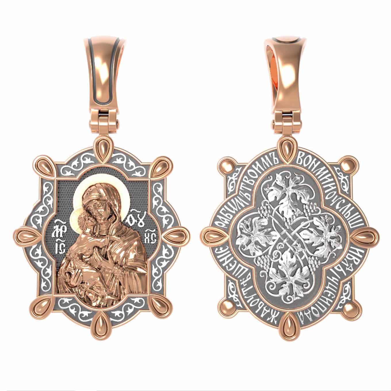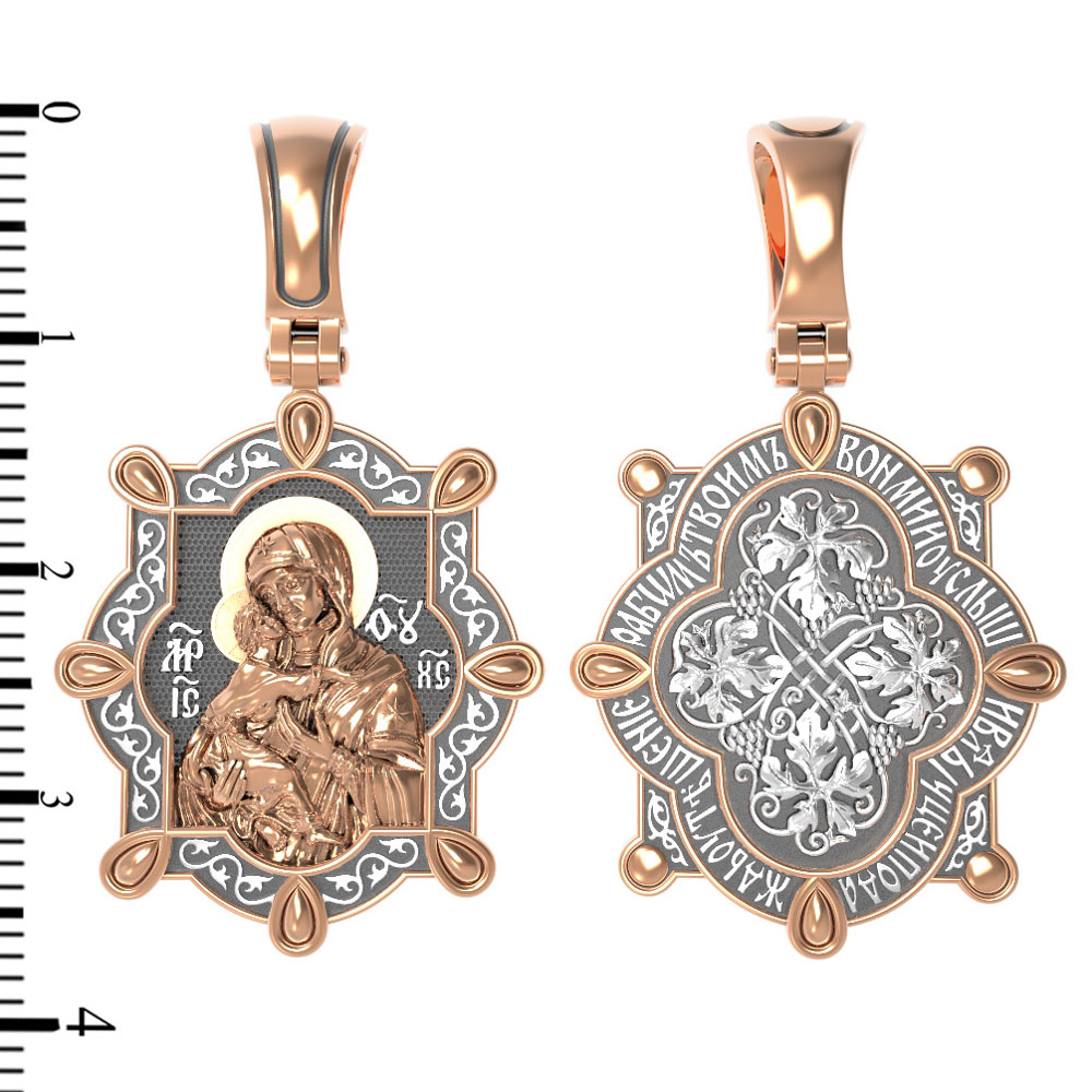 Лицевую сторону возглавляет Владимирская икона Божией Матери — самая великая русская святыня, многие века бывшая олицетворением нашей земли. Перед ней венчались на царство государи, избирались патриархи. Пречистой Богородице Владимирской клялись в верности Отечеству солдаты и за нее умирали на поле брани. Именно на ее защиту более всего уповала Россия в самые страшные периоды своей истории. Владимирская икона Божией Матери, по преданию, была написана на доске трапезного стола из дома Иисуса Христа. На Русь она была привезена в начале XII века и с тех пор почитается как главная святыня нашего Отечества. Перед ней молитвенно просят Богородицу об исцелении от телесных недугов, в частности, заболеваний сердца и сердечнососудистой системы. За помощью к ней обращаются во время бедствий, когда нуждаются в защите от врагов.