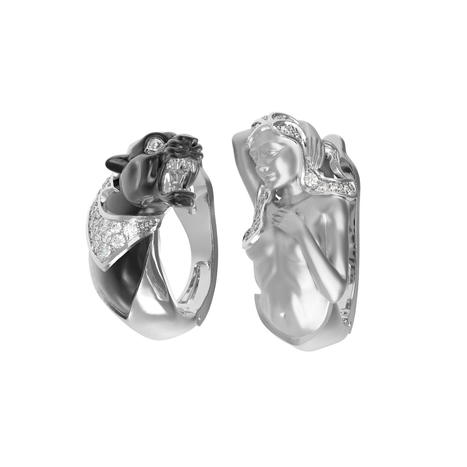Серьги из белого золота 585 пробы из коллекции De Luxe — Мифология представляют собой смелое прочтение мифологических образов, воплощенных в ювелирном искусстве. Этот аксессуар создан для тех, кто ценит нетривиальный дизайн и выразительные формы. Одно изделие выполнено в виде грациозной пантеры, другое — в виде женского силуэта, что подчеркивает концептуальность украшения. Нестандартный подход делает данные серьги универсальными: они станут эффектным дополнением образа как для женщин, так и для мужчин, предпочитающих премиальные акценты в своем стиле.