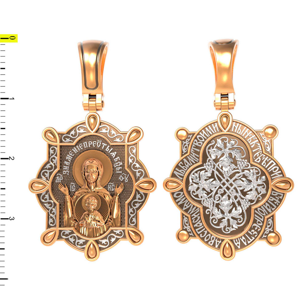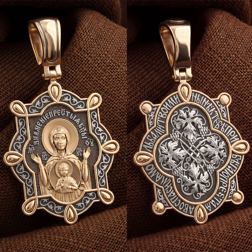 В центр образка помещен образ Божией Матери «Знамение», прославившийся многими чудесами в Новгороде в XII веке. Икона эта чтится как одна из самых великих святынь Русской земли. Молитвенно воздетые руки Богородицы означают заступничество за людей пред Богом. Рядом с Ней, на фоне круглого щита, — благословляющий Божественный Младенец — Спас-Эммануил.