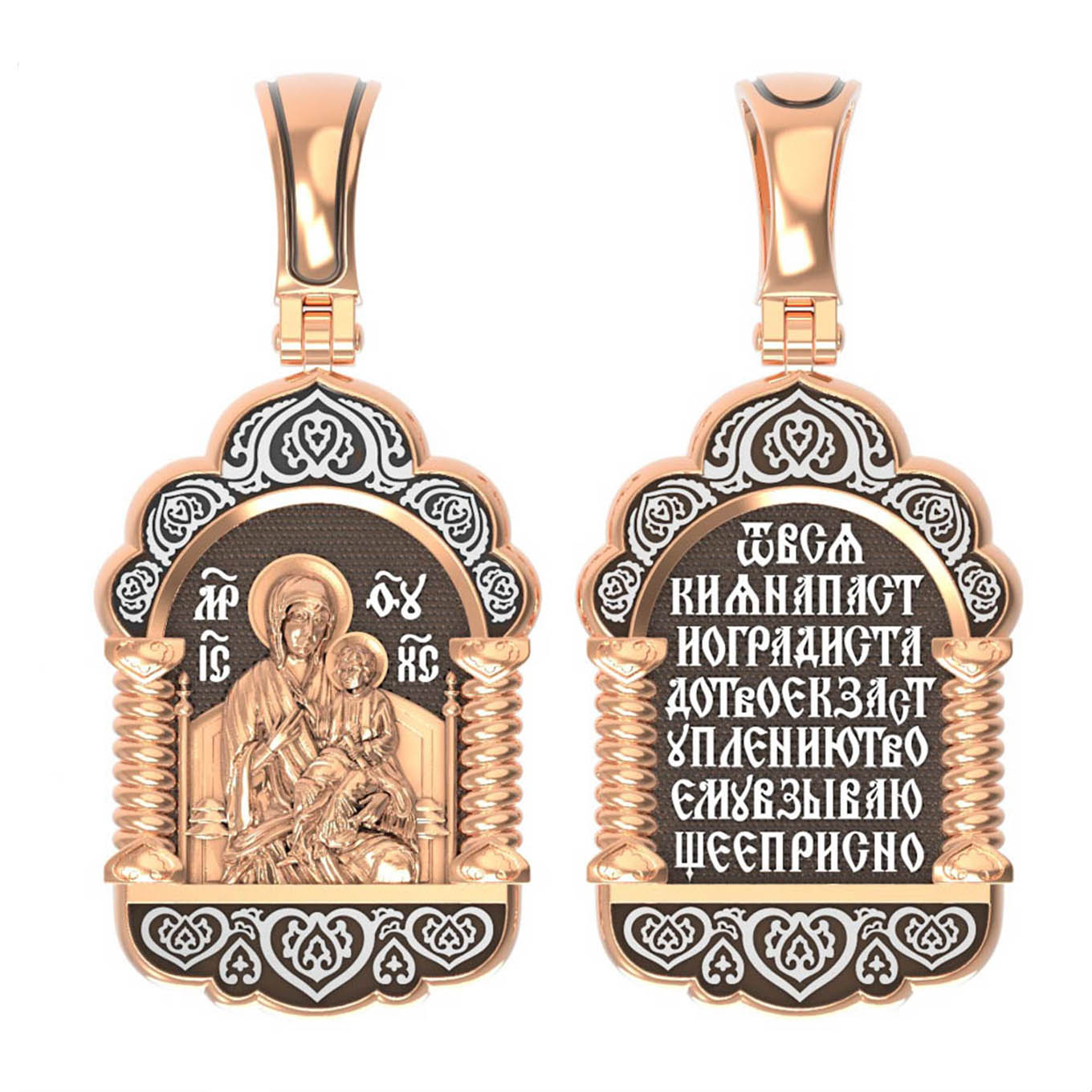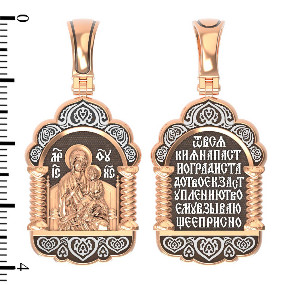 На обороте образка написана молитва Богородице в честь Ее иконы «Всецарица» (Пантанасса): «От всякия напасти огради стадо Твое, к заступлению Твоему взывающее присно».