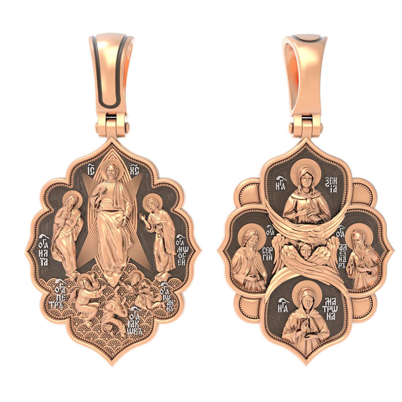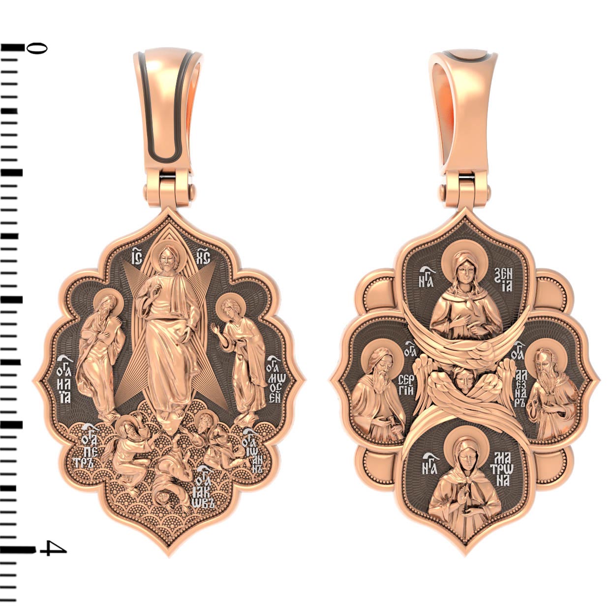 Вверху образка изображена блаженная Ксения Петербургская. После смерти супруга приняла на себя подвиг юродства, чтобы отмолить его перед Богом. Ксения раздала имущество, одела мундир мужа и назвалась его именем, уверяя всех, что умер не он, а она сама. С этого времени в течение 45 лет блаженная скиталась по улицам Петербурга. Ксения сподобилась дара прозрения будущего и человеческих сердец, а также особой помощи в устроении жизни. Эти чудеса она продолжает творить и за гробом.