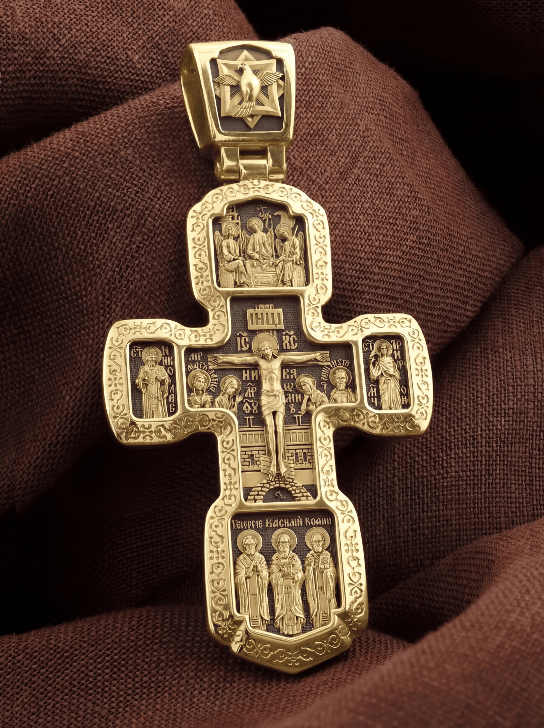 Внизу изображены три святителя, творцы Божественной Литургии. В центре — святой Василий Великий, справа — святой Иоанн Златоуст, а слева — святой Григорий Богослов. В центральной части оборотной стороны Креста изображена икона Божией Матери «Всецарица» или «Пантанасса». Чудотворная икона была написана в XVII веке и находится на Святой Горе Афон. Икона совершила множество чудесных исцелений. Пречистая Богородица наставляет на праведный путь, помогает укрепить веру, найти утешение. По бокам изображены прп. Сергий Радонежский и святитель Спиридон Триумфунский. Сверху и снизу помещены изображения Ангела-Хранителя. На кулонном кольце помещено изображение Спаса Нерукотворного. Ему придается победное и защитное значение.