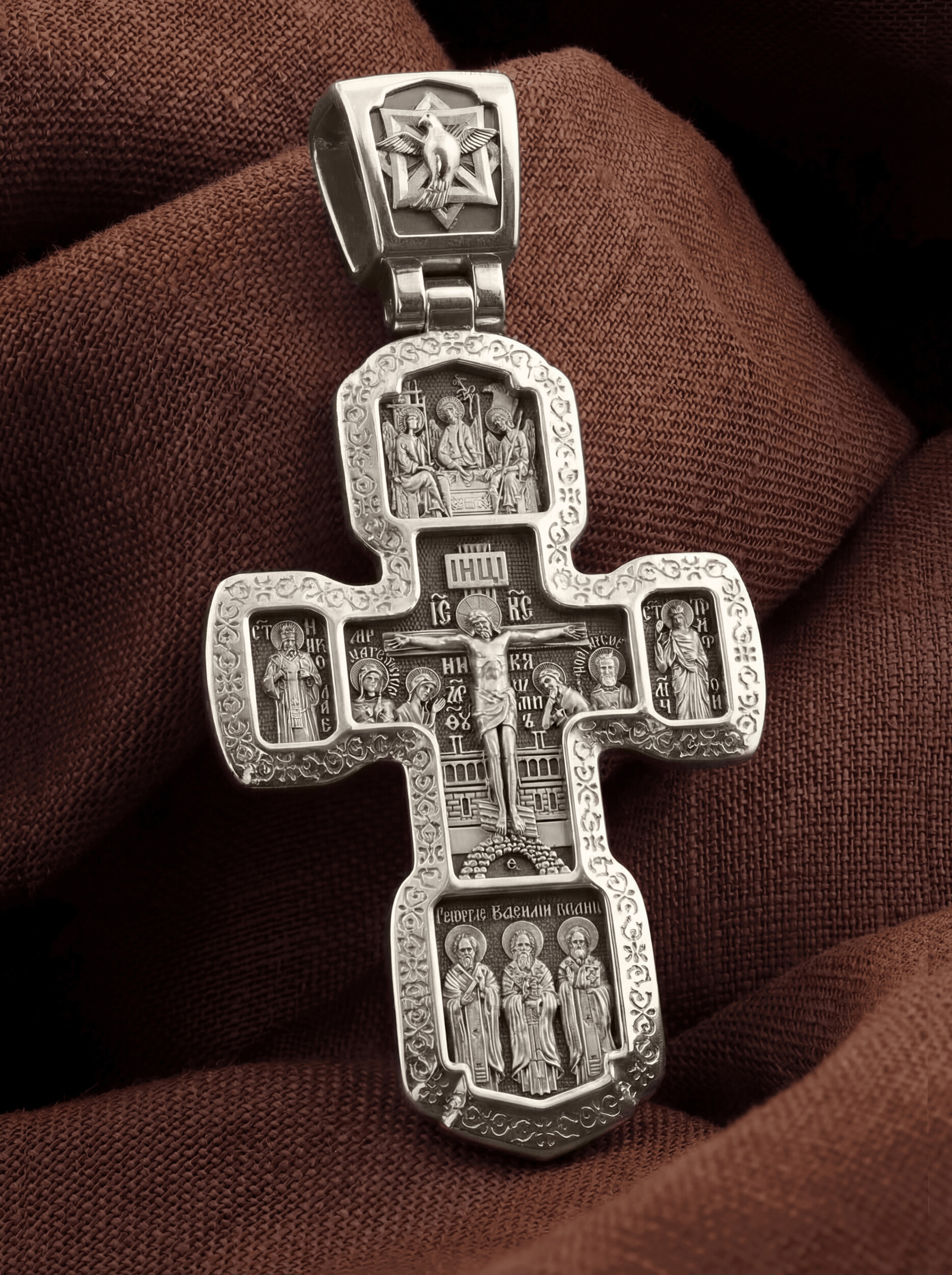 Центральную часть лицевой стороны занимает Распятие Господа Иисуса Христа с предстоящими Ему святыми, которые, по преданию, находились у Креста Господа во время Его казни. Слева — Пресвятая Богородица и жены-мироносицы — равноапостольная Мария Магдалина и святая Мария Клеопова, справа — праведный Иосиф Аримофейский и мученик Лонгин Сотник. Над Распятием помещена икона Святой Троицы. Ангелы сидят за трапезным столом вокруг чаши, которая символизирует грядущую жертву Второго Лица Пресвятой Троицы, Бога Сына. Слева от Господа находится святой Николая Чудотворец, справа — святой мученик.