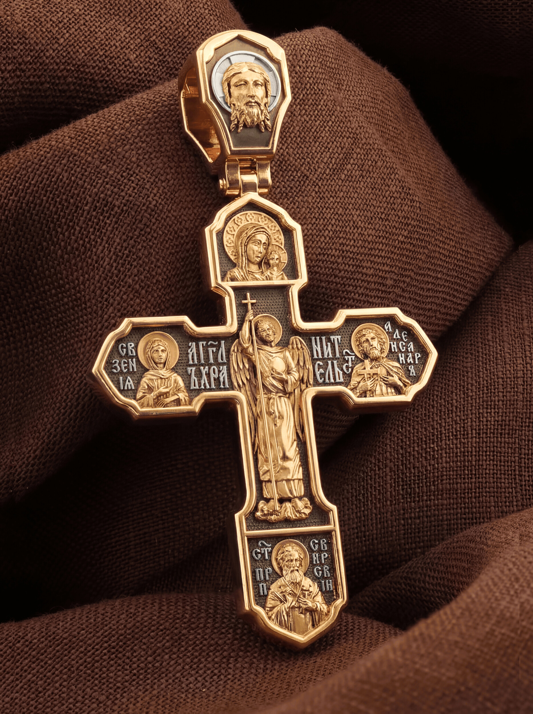 На лицевой стороне изображено Распятие Господа Иисуса Христа, над вершиной которого помещены титлы Его святого имени — «ИС ХС». Под основной перекладиной надписи — «НИКА», что в переводе с греческого означает «победитель», и словосочетание «СЫН БОЖИЙ», что означает божественную природу Иисуса Христа. С двух сторон Христу предстоят Пресвятая Богородица и св. Андрей Первозванный. Внизу — образ Архангела Михаила, могучего защитника от злых сил. Это он низверг дьявола и встал во главе ангелов для борьбы с бесовскими силами. Его имя означает «Кто яко Бог?».
