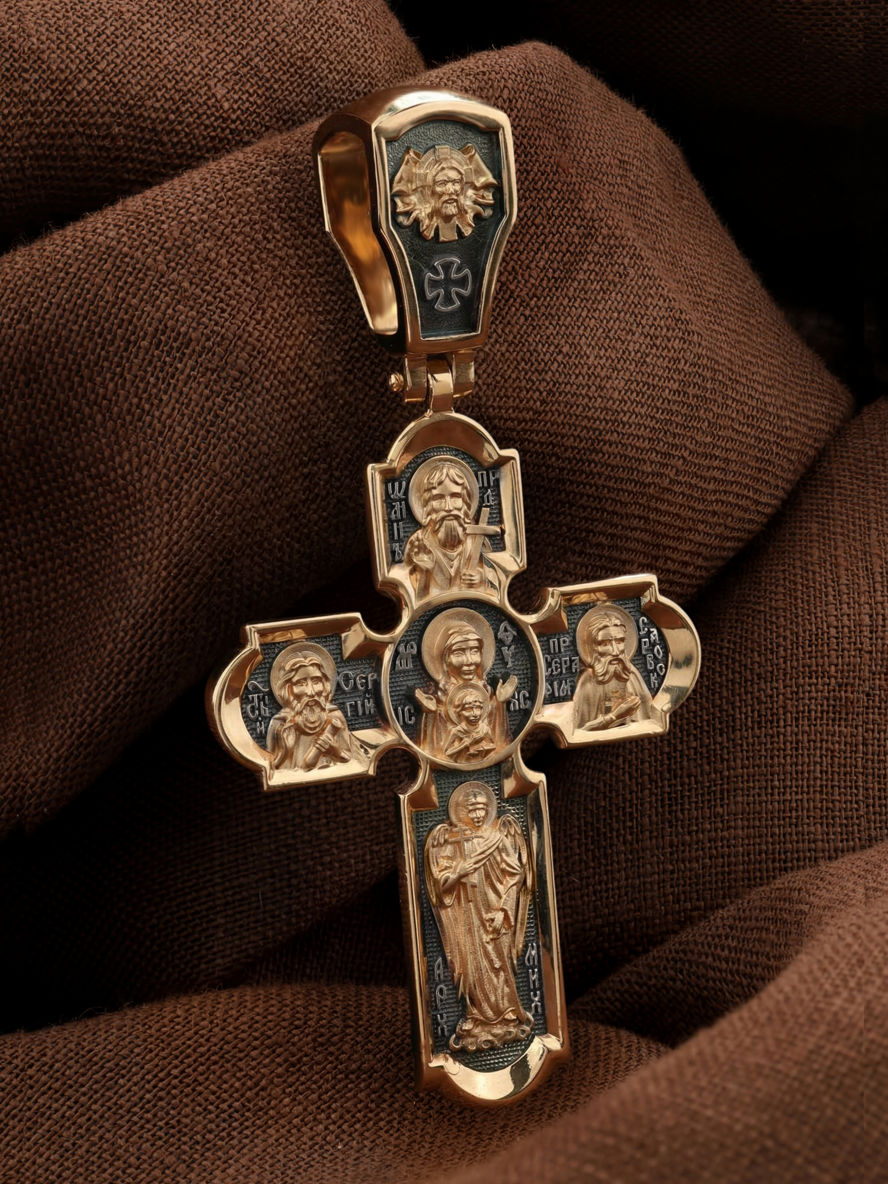 Центральную часть оборота креста украшает икона Божией Матери «Знамение». Икона «Знамение» написана по пророчеству пророка Исайи, предрекшего, что Господь Иисус Христос родится от Девы. На кресте внизу изображен Архангел Михаил, слева — прп. Сергий Радонежский, справа — образ Преподобного Серафима Саровского, вверху — последний пророк, почитающийся в христианстве, Предтеча Господень Иоанн Креститель. На кулонном кольце помещено изображение Спаса Нерукотворного — образ Спасителя, который Он запечатлел на плате и передал для исцеления больному проказой царю Эдессы. Ему придается победное и защитное значение.
