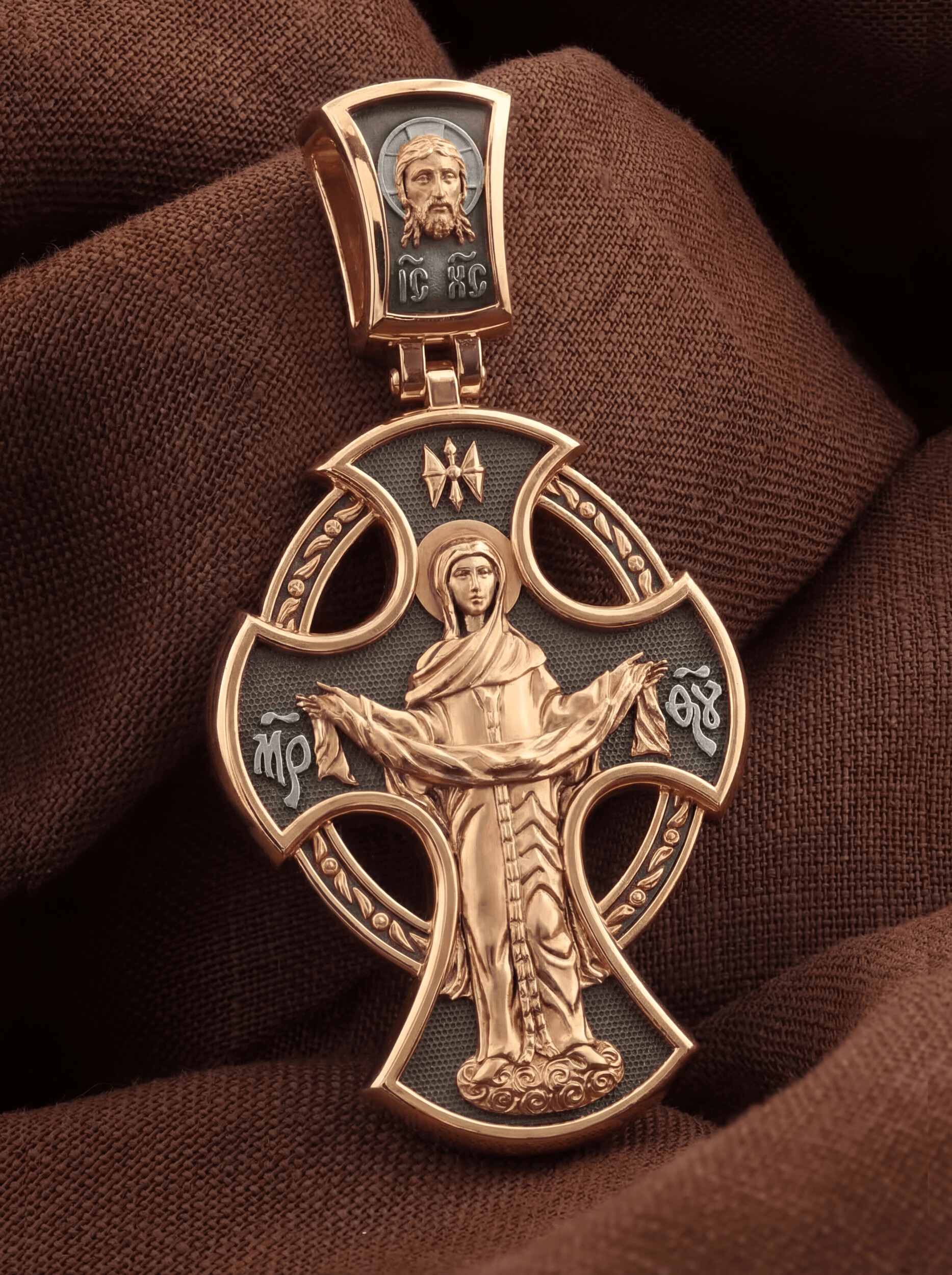 На обороте креста изображена икона Покрова Пресвятой Богородицы. Праздник Покрова Божией Матери является воспоминанием чуда, которое произошло во Влахнернской церкви 1 (14) октября 910 года: Пресвятая Богородица явилась верующим над алтарем храма и распростерла над ними Свое покрывало. В этот день Божья Матерь открыла людям, что Она является Ходатаицей за них перед Богом. Богородица простирает Свой молитвенный покров над всеми православными христианами и умоляет Сына Своего о даровании вечного спасения каждому человеку. На кулонном кольце помещено изображение Спаса Нерукотворного — образ Спасителя, который Он запечатлел на плате и передал для исцеления больному проказой царю Эдессы. Ему придается победное и защитное значение.