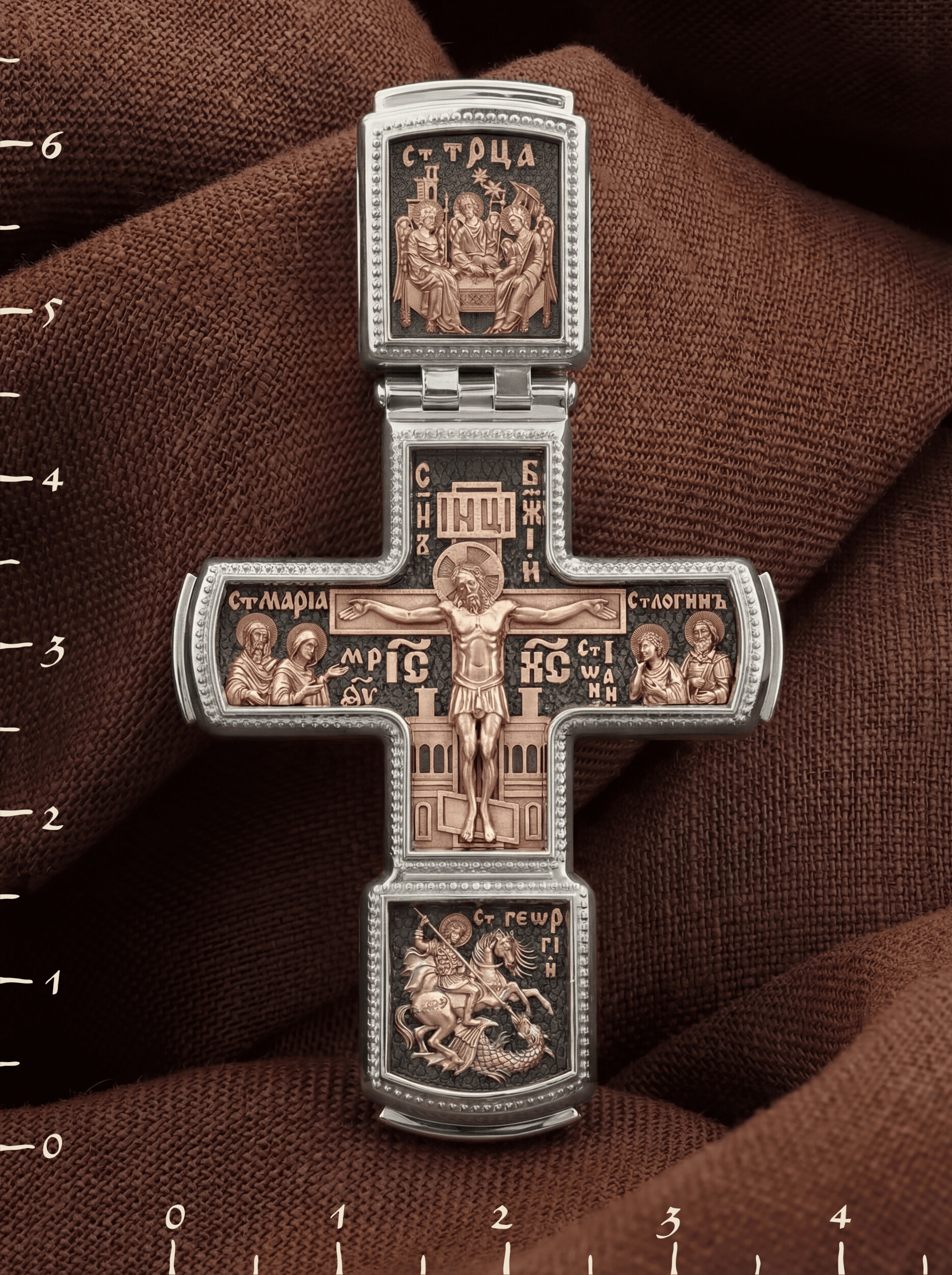 На кресте изображено Распятие Господа нашего Иисуса Христа. Ему предстоят Святая Мария Магдалина, Пресвятая Богородица, апостол Иоанн и Святой Иосиф, свидетели крестных страданий Господа. На оглавии помещена икона Святой Троицы, на которой запечатлено явление Триединого Бога праотцу Аврааму в виде трех ангелов. В нижнем клейме изображено Чудо Святого Георгия о змие. Великомученик Георгий почитается как покровитель воинов, защитник от злых сил, помощник в духовной борьбе.