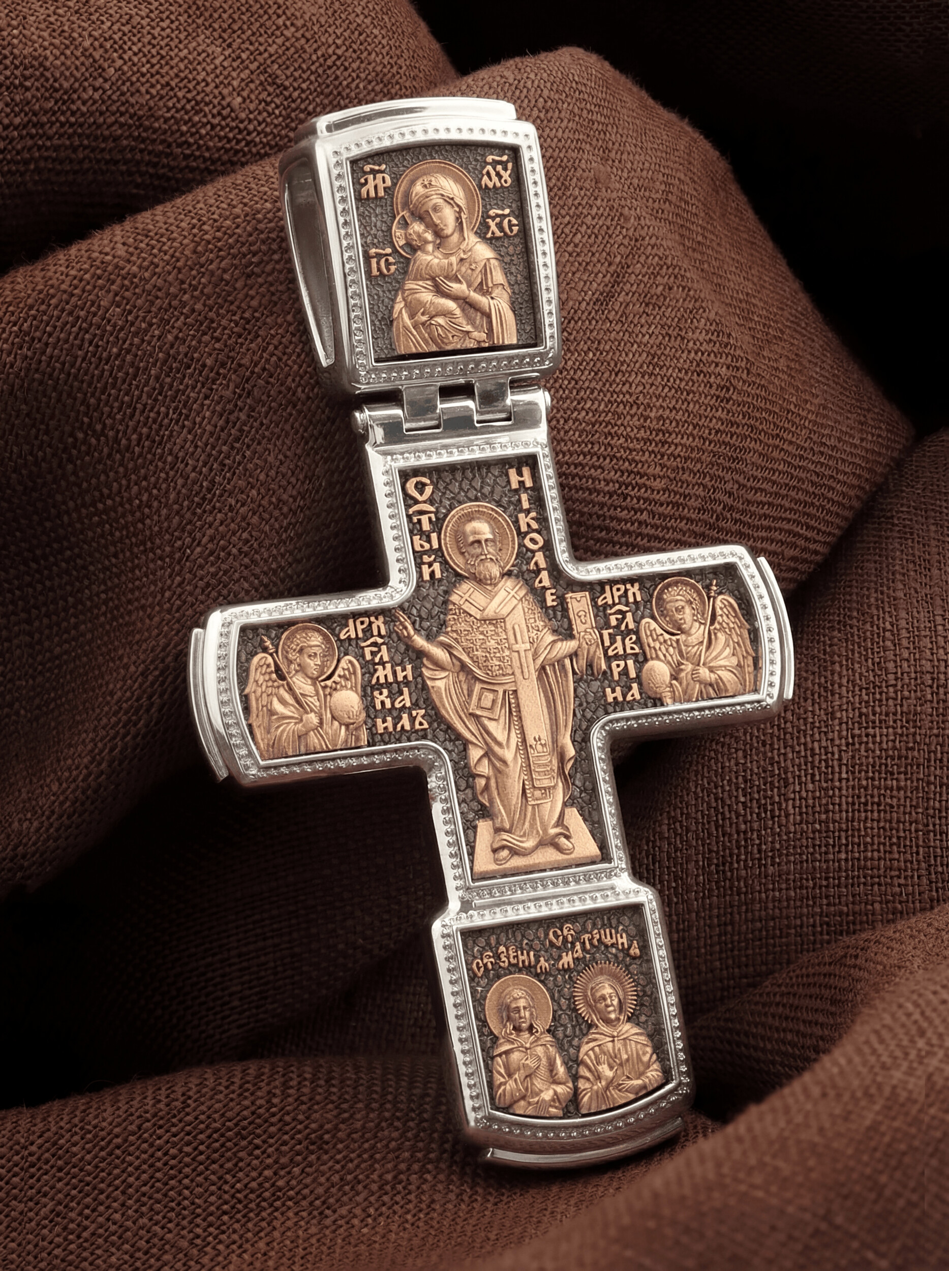 В центре на обороте — самый почитаемый в Православной Церкви святой, Николай Чудотворец, которого еще называют Николай Угодник за то, что он угодил своей жизнью Богу. Ему молятся, отправляясь в путешествие, особенно по морю, просят исцеления в различных недугах, помощи в торговых делах, учебе и поисках достойного супруга. С двух сторон от Николая Чудотворца помещены образы архангелов Михаила и Гавриила. Вверху — Владимирская икона Божией Матери — самая великая русская святыня, многие века бывшая олицетворением нашей земли. Перед ней венчались на царство государи, избирались патриархи. Пречистой Богородице Владимирской клялись в верности Отечеству солдаты и за нее умирали на поле брани. Именно на ее защиту более всего уповала Россия в самые страшные периоды своей истории. В нижнем клейме — иконы двух святых помощниц от всех недугов, блаженных Ксении Петербургской и Матроны Московской.