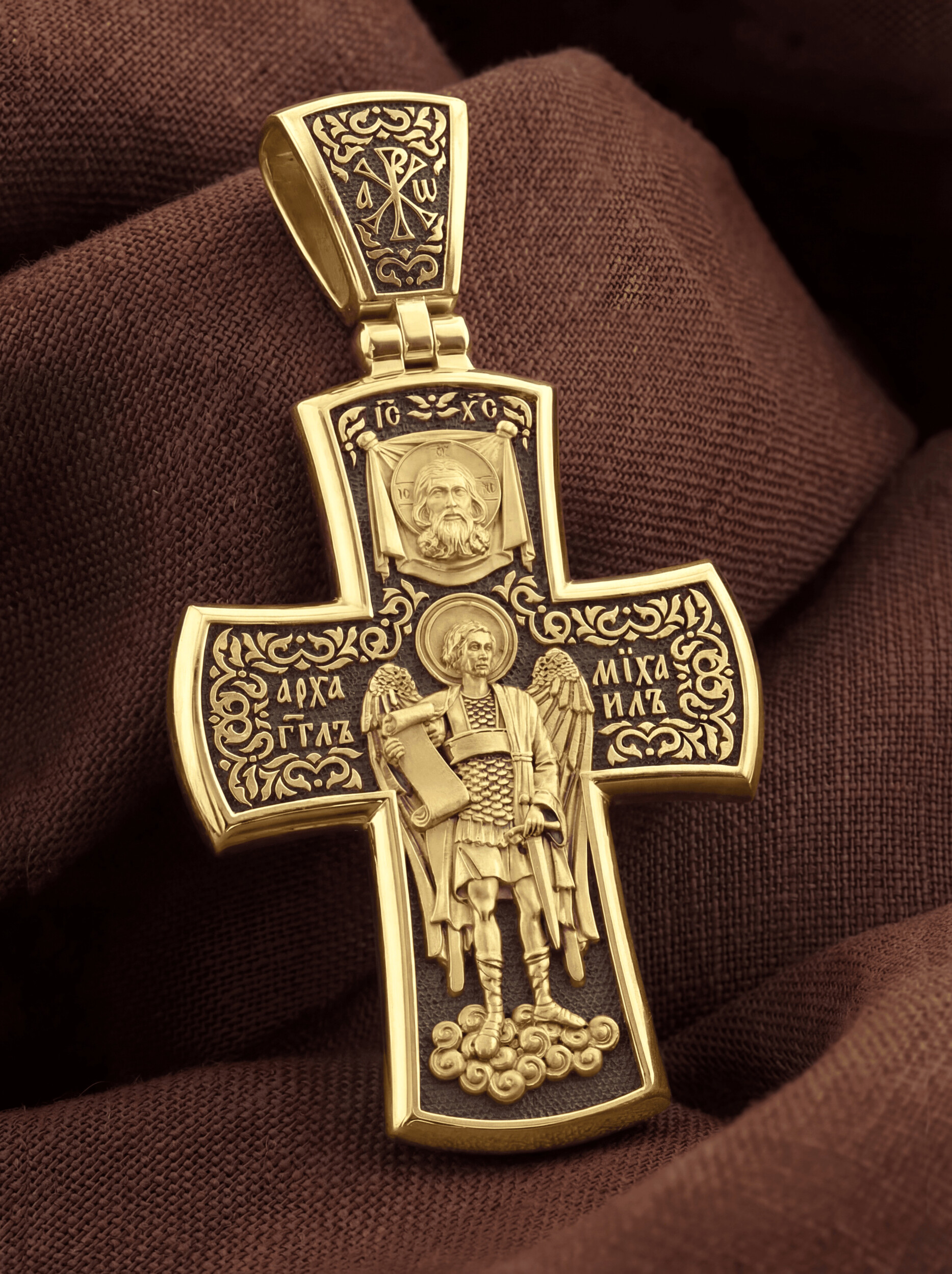 В центре оборотной стороне креста помещен образ Архангела Михаила — верного служителя Божия, который низринул с Неба возгордившегося денницу с другими павшими духами. В Православии его называют Архистратигом, что означает глава святого воинства Ангелов и Архангелов.