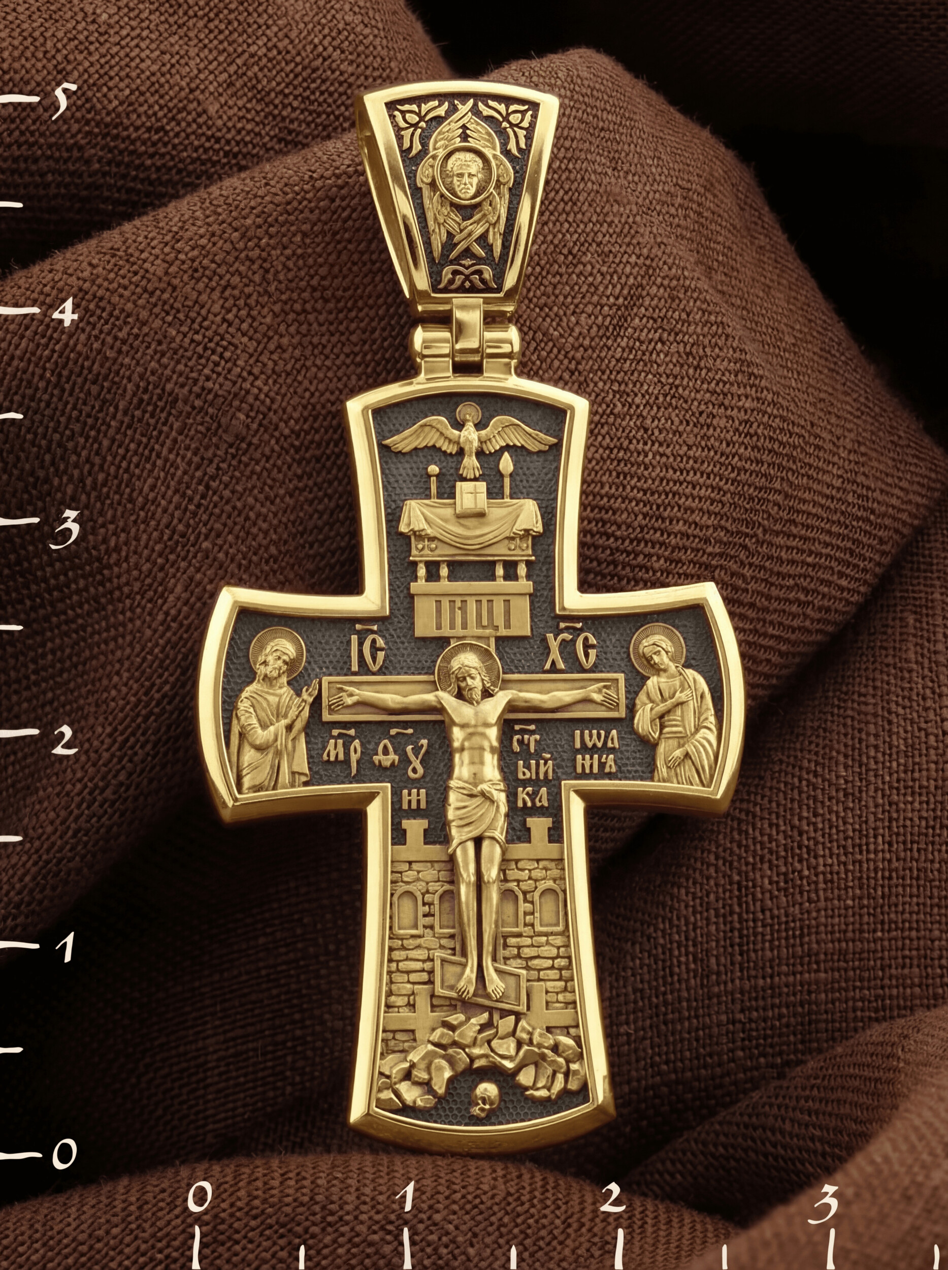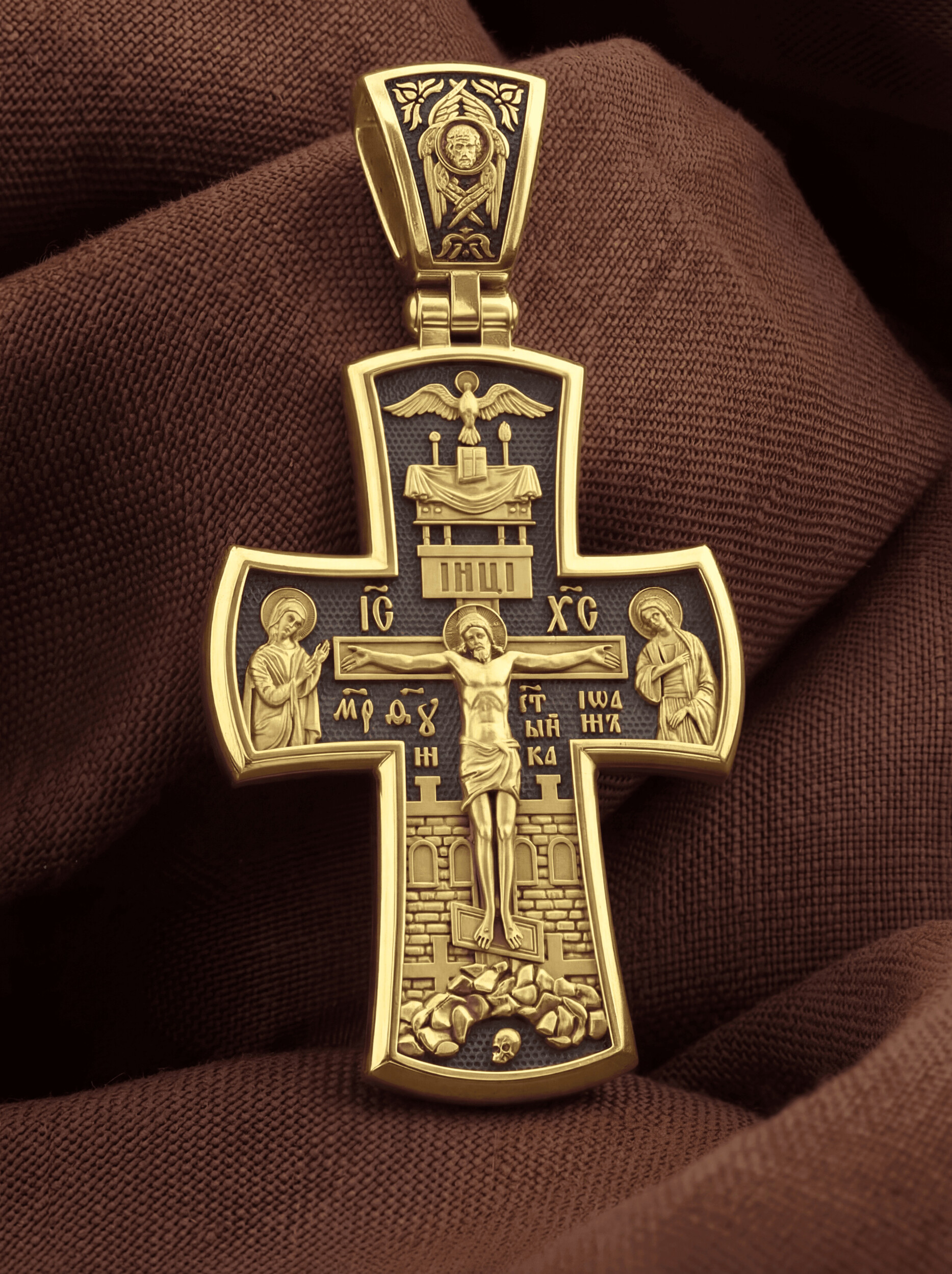 На лицевой стороне креста изображено Распятие Господа и Спасителя нашего Иисуса Христа, отдавшего Себя на смерть, для искупления грехов мира. Господь сказал: кто хочет идти за Мною, отвергнись себя, и возьми крест свой, и следуй за Мною. (Мк. 8: 34). Крест является символом жертвенной любви всеблагого Бога к падшим людям, всепобеждающим духовным оружием христиан, основанием и средоточием церковной жизни. На верхней перекладине помещена надпись «IС» « ХС», что означает Иисус Христос. Ниже — слово «НИКА», что означает «победитель». Слева от Распятия изображена Пресвятая Богородица, справа — апостол и евангелист Иоанн Богослов, один из ближайших учеников Иисуса Христа. За Распятием высится Иерусалимская стена, в знак того, что Господь был распят вне стен города. Возвышение, на котором стоит Крест, символизирует гору Голгофу, на которой произошло Распятие. Под подножием Креста изображена покоящаяся голова (череп) Адама.
