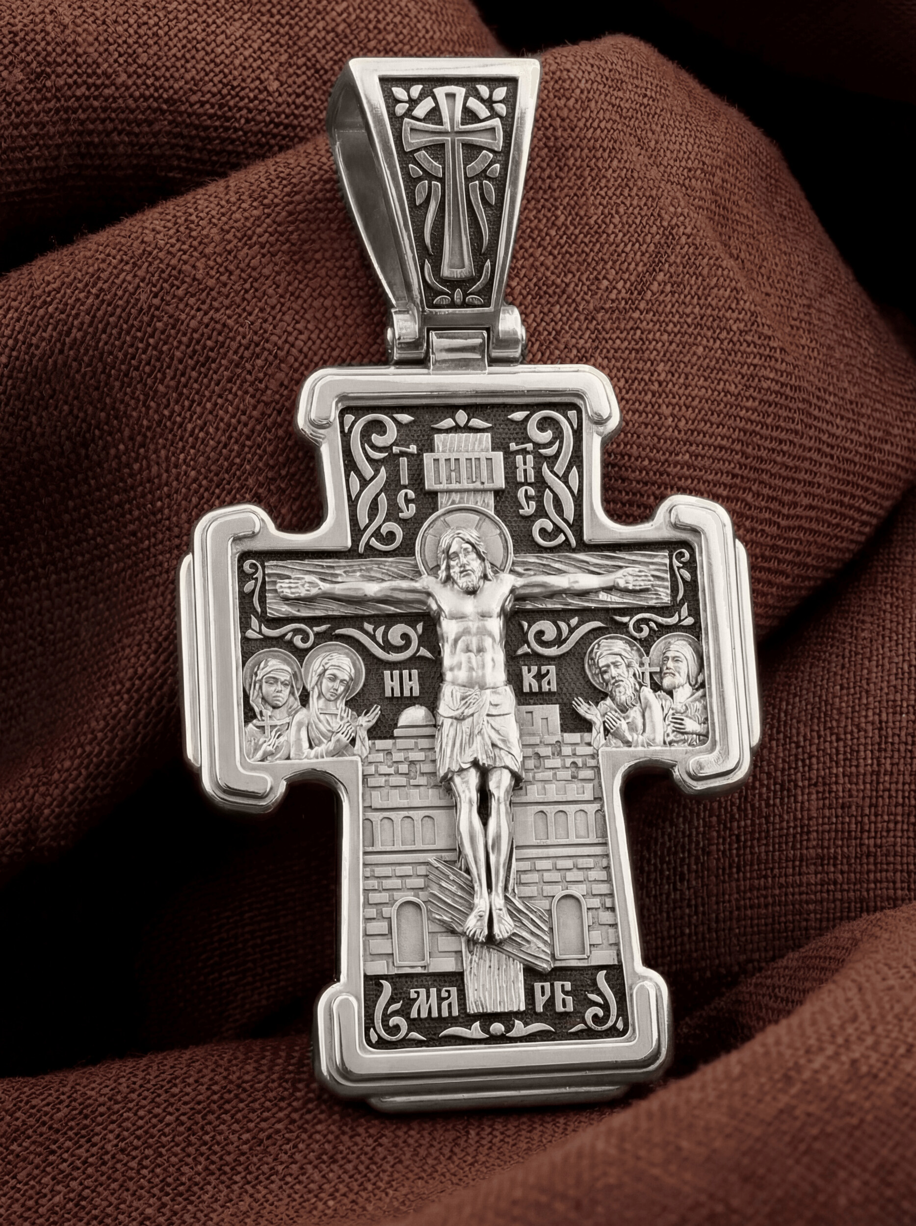 На лицевой стороне креста изображено Распятие Господа и Спасителя нашего Иисуса Христа. Крест- символ спасения и искупления рода человеческого, знамение победы над смертью и адом. Иисус Христос, как искупительная жертва освобождения человечества от власти греха, умер крестной смертью и в третий день воскрес. На верхней табличке, выше головы Иисуса, расположена надпись, составленная Понтием Пилатом — «IНЦI». Она означает «Иисус Назорей, Царь Иудейский». Рядом расположена надпись «IС» « ХС». Она означает Иисус Христос. Ниже — слово «НИКА», что означает «победитель». Слева от Распятия — Пресвятая Богородица и святая мироносица Мария Магдалина с крестом в руке. Справа — апостол и евангелист Иоанн Богослов, один из ближайших учеников Иисуса Христа, и сотник Лонгин с крестом в правой руке и копьем — в левой. За крестом высится Иерусалимская стена. Надпись «МЛРБ» — «место лобное рай бысть» означает, что место лобное стало раем, помещается в нижней части креста. На кулонном кольце помещен крест.