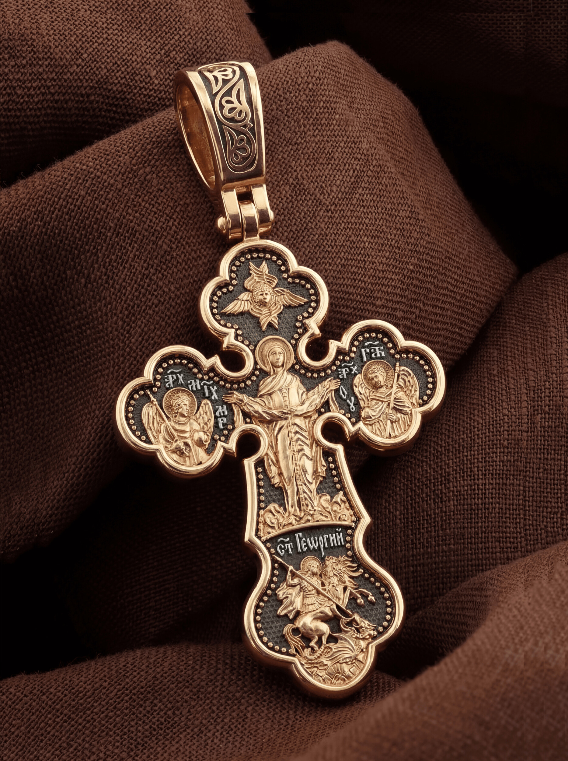 Центральную часть оборотной стороны креста украшает икона Божией Матери «Покров Пресвятой Богородицы». Праздник Покрова Пресвятой Богородицы пришел на Русь в XII веке из Византии и стал одним из самых почитаемых. Пресвятая Богородица простирает Свой молитвенный покров над всеми православными христианами и умоляет Сына своего о даровании вечного спасения каждому человеку. Над образом помещен шестикрылый Серафим. Справа помещено изображение Архангела Гавриила, слева- Архангела Михаила. На кресте внизу помещено изображение Святого Великомученика Георгия Победоносца — одного из самых почитаемых и удивительных святых. Он изображен как воитель, сидящий на вздыбленном коне и поражающий копьем огнедышащего змея. Змей символизирует собою сатанинские силы.
