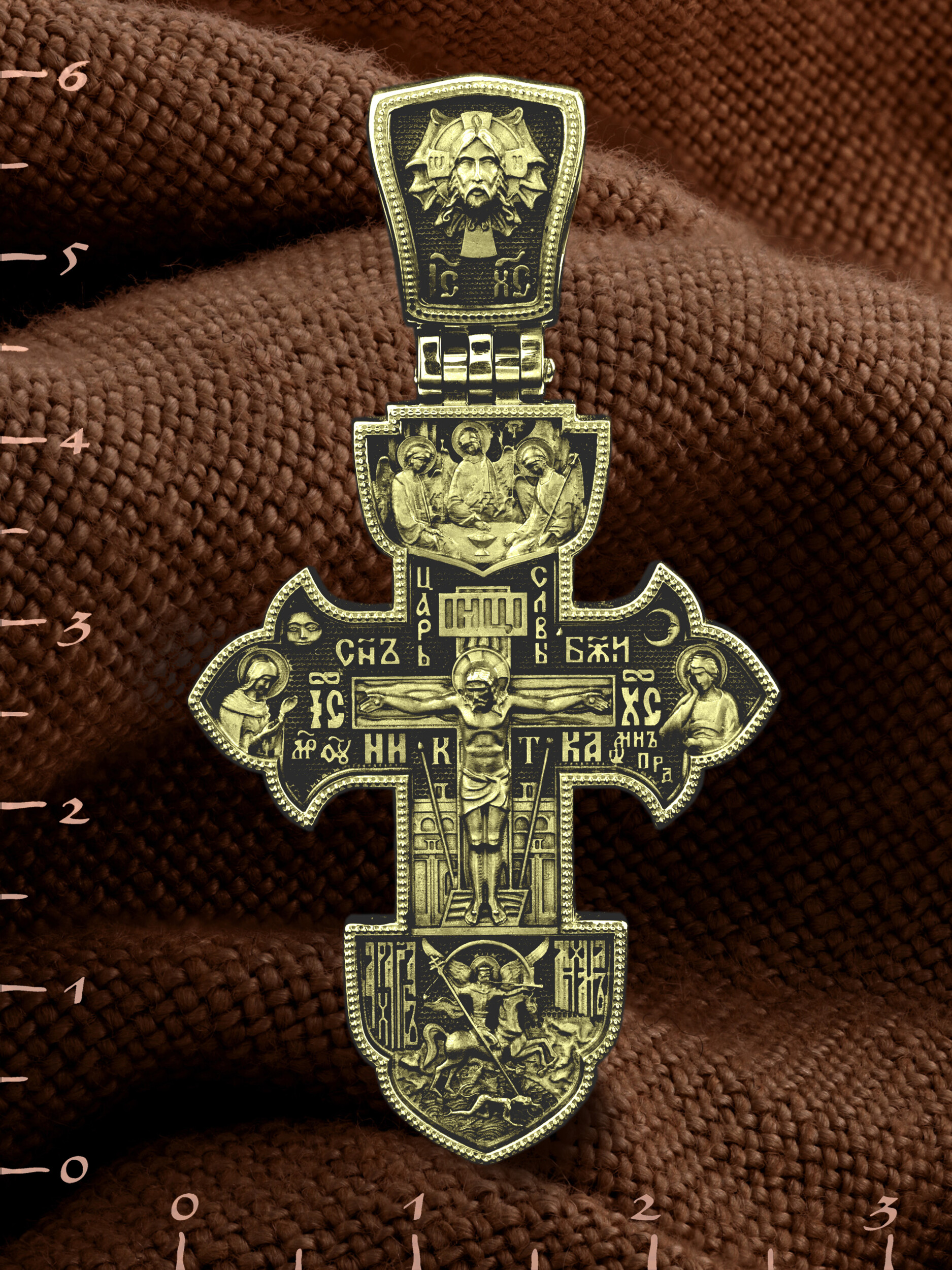 На лицевой стороне креста изображено Распятие Господа и Спасителя нашего Иисуса Христа. Крест- символ спасения и искупления рода человеческого, знамение победы над смертью и адом. Иисус Христос, как искупительная жертва освобождения человечества от власти греха, умер крестной смертью и в третий день воскрес. На верхней табличке, выше головы Иисуса, расположена надпись, составленная Понтием Пилатом — «IНЦI». Она означает «Иисус Назорей, Царь Иудейский». Распятие сопровождается каноническими надписями. Над Распятием находится надпись «Царь Славы». Надпись «IС» « ХС» означает Иисус Христос и помещается на разных сторонах поперечной (большой) перекладины креста. Рядом расположены надпись «Сын Божий» и слово «НИКА», что означает «победитель». Слева от Распятия изображена Пресвятая Богородица, справа — апостол и евангелист Иоанн Богослов, один из ближайших учеников Иисуса Христа. За Распятием высится Иерусалимская стена, в знак того, что Господь был распят вне стен города. Вдоль креста изображены копие сотника Лонгина и трость с губкой и буквы «К» и «Т». Рядом — слово «НИКА», что означает «победитель». Над распятием помещено изображение иконы Святой Троицы в виде трех ангелов. Ниже распятия изображен Архангел Михаил, восседающим на огненном крылатом коне. От уст архангела исходит труба, возвещающая наступление Второго пришествия и Страшного суда, а над его распростертыми крыльями изображена радуга. Копьем с крестом он пронзает поверженного сатану. На кулонном кольце изображен Нерукотворный образ Господа и Спасителя нашего Иисуса Христа, чудесно отпечатавшийся на плате, котором Христос вытер свой лик.