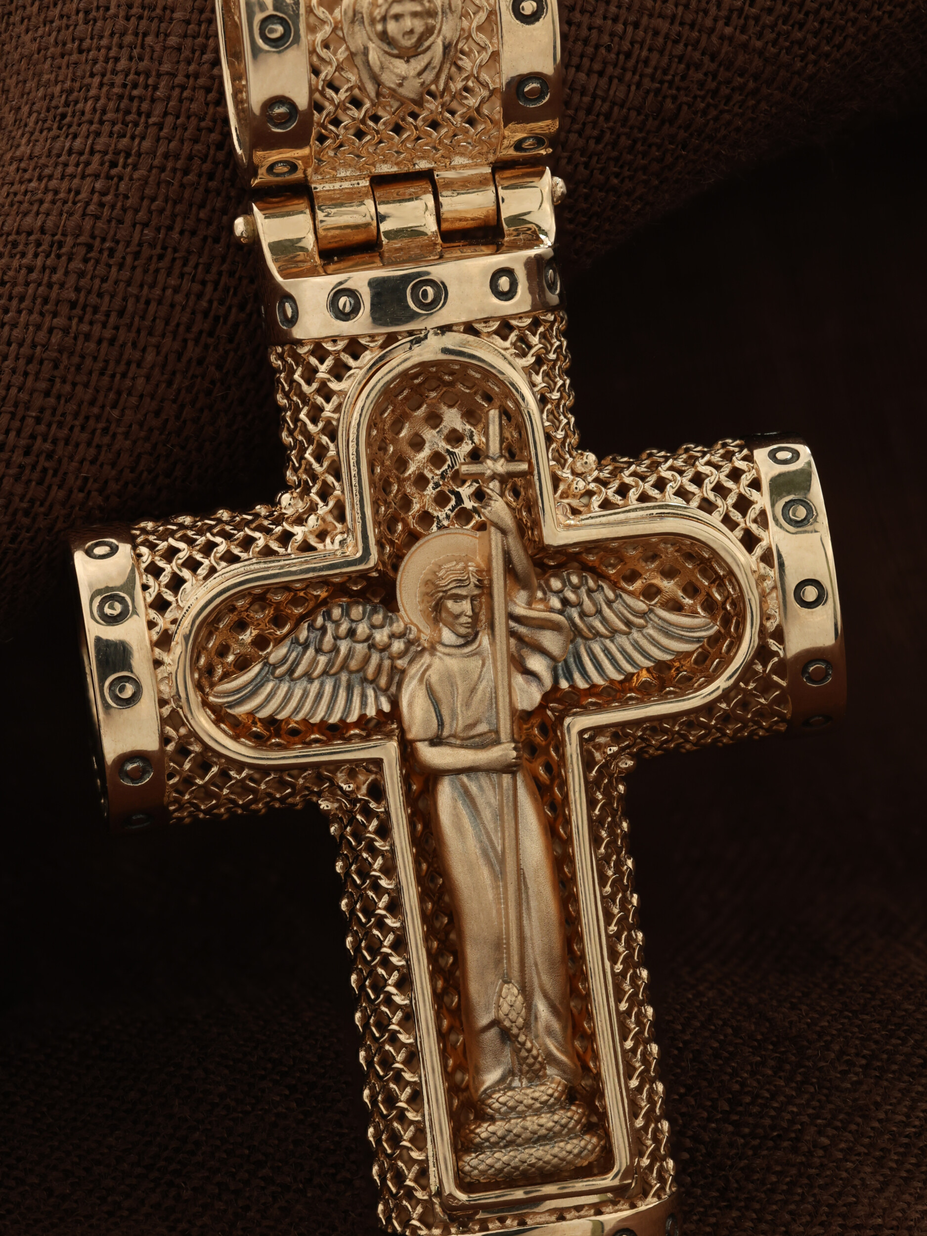 На лицевой стороне креста изображено Распятие Господа и Спасителя нашего Иисуса Христа. Крест- символ спасения и искупления рода человеческого, знамение победы над смертью и адом. Иисус Христос, как искупительная жертва освобождения человечества от власти греха, умер крестной смертью и в третий день воскрес. Распятие сопровождается каноническими надписями. На верхней табличке, выше головы Иисуса, расположена надпись, составленная Понтием Пилатом — «IНЦI». Она означает «Иисус Назорей, Царь Иудейский». Надписи «IC» «ХC», означает Иисус Христос, «НИКА», что означает Победитель, «Царь Славы» и «Сын Божий», размещается на разных сторонах поперечной перекладины креста. Крест стоит на горе камней, символизирующих Голгофу, которая обозначена надписью «Г Г». В ее основании различается череп — это голова Адама, обозначенный надписью «Г А». Надпись «МЛРБ» — «место лобное рай бысть» означает место лобное стало раем. Вдоль креста изображены орудия Страстей Христовых: копие сотника Лонгина, которым пронзили подреберье мёртвого Иисуса, чтобы убедиться в Его смерти, и трость с губкой, с которой Иисуса напоили уксусом. Они обозначены буквами «К» и «Т». На кулонном кольце размещен «Нерукотворный образ Иисуса Христа», на оборотной стороне кулонного кольца- шестикрылый Серафим.