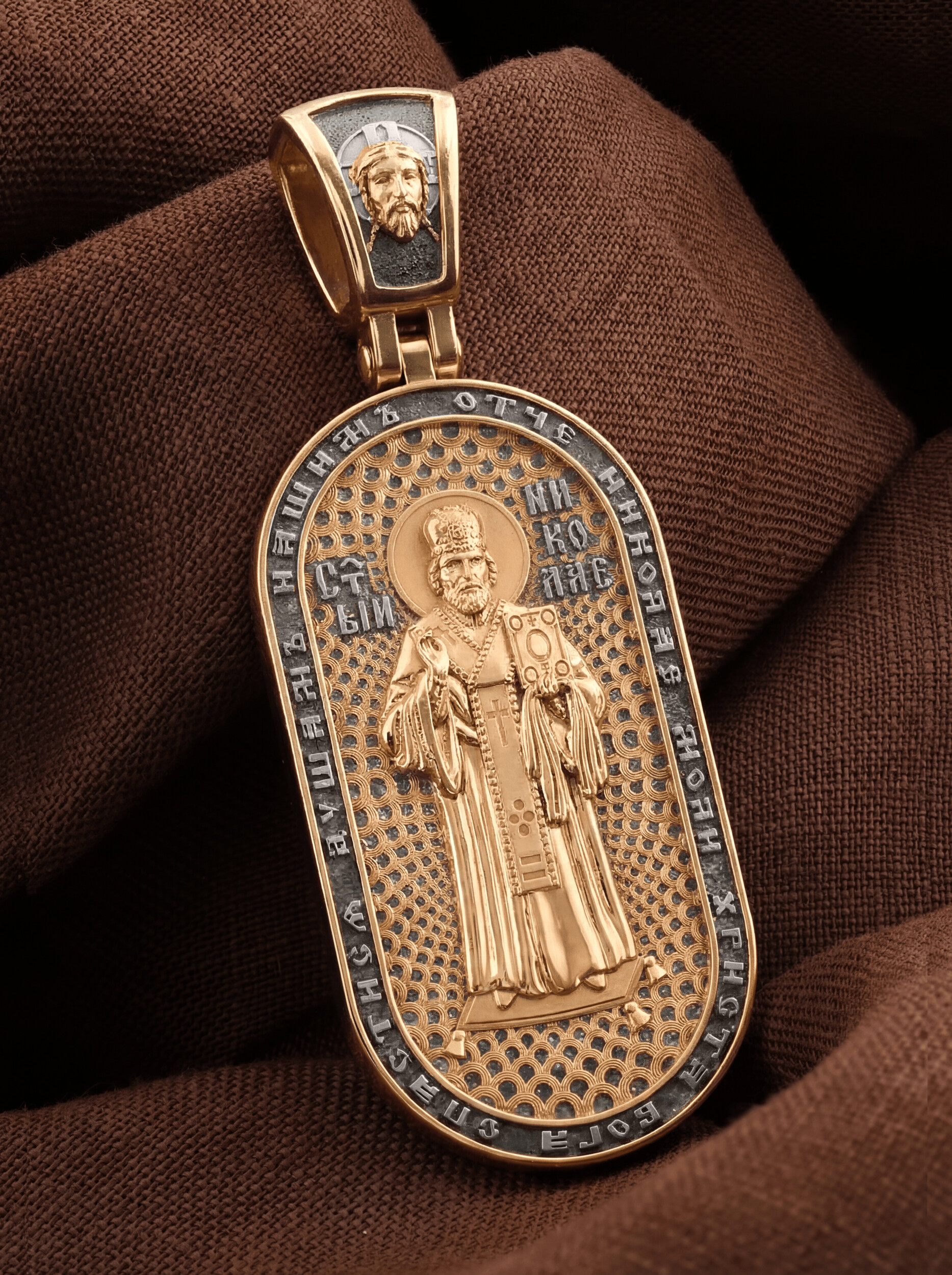 На оборотной стороне изображен Святой Николай Чудотворец, которого еще называют Николай Угодник — помощник в делах, покровитель учащихся, утешитель обиженных и нуждающихся, целитель самых страшных и тяжелых недугов, предстатель и молитвенник за людей перед Богом. Также Святитель Николай Чудотворец известен своими молитвами за путешественников, когда непрестанный ветер и бушующие волны утихают и корабль заходит в спокойную гавань. По контуру написана молитва: «Отче, Николай, моли Христа Бога спастися душам нашим». На кулонном кольце помещено изображение Спаса Нерукотворного.