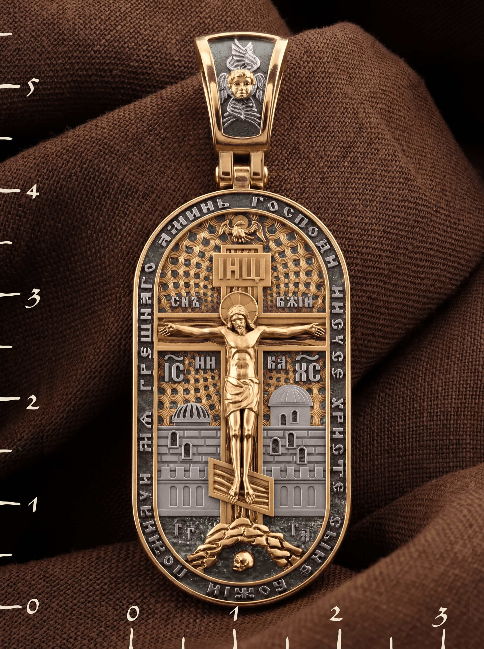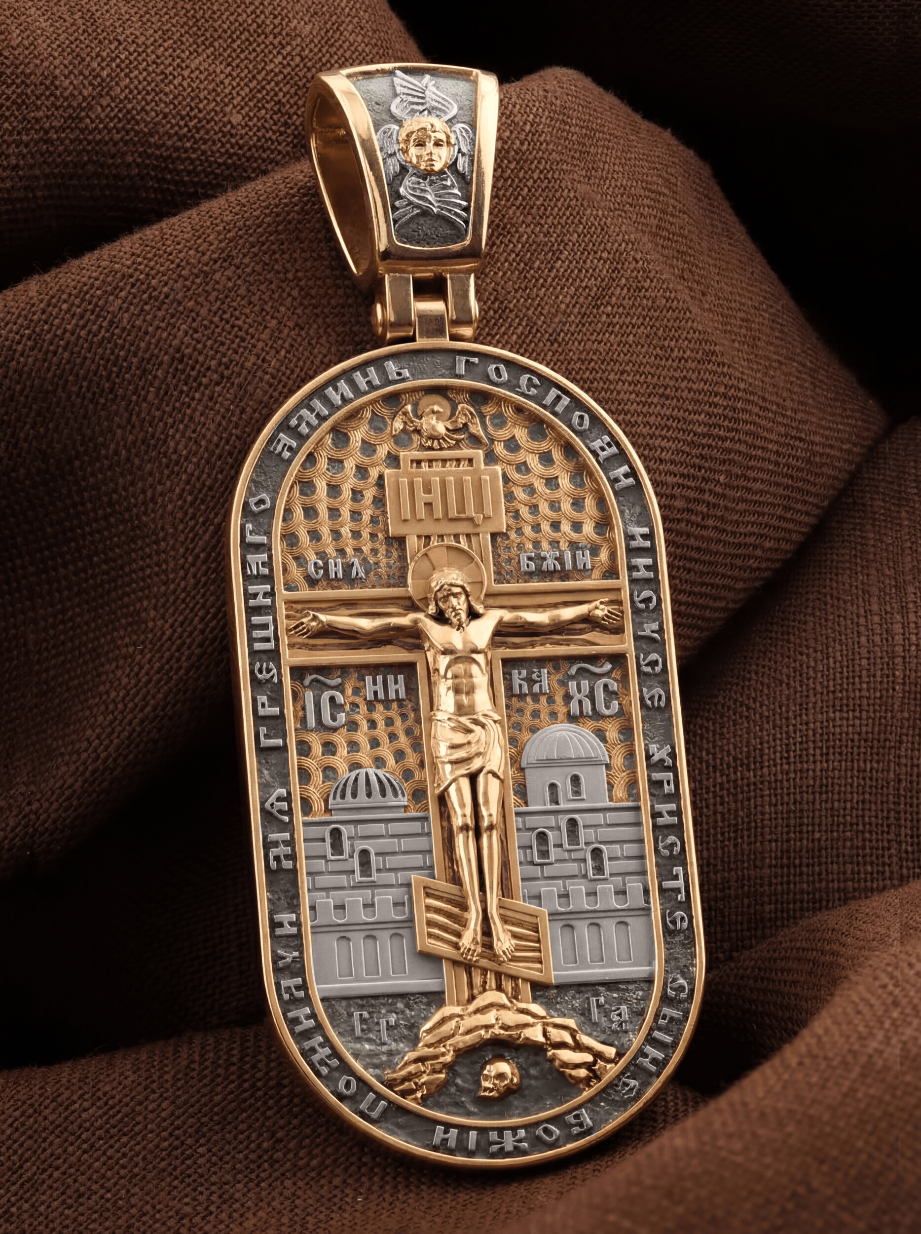 Центральную часть лицевой стороны занимает Распятие Христа — образ жертвы, принесенной Господом за грехи людей. Именно ко Христу, сошедшему на землю ради нашего спасения, возносятся все молитвы. Рядом с Его образом помещены слова — «НИКА» (греч. — Победитель) и «СЫН БОЖИЙ». Эти слова характеризуют Господа как Великого Архиерея, победителя смерти. Также Распятие сопровождается надписями, олицетворяющими Христа — это святое имя Христа «IC» (Иисус) «ХС» (Христос). Верхняя перекладина символизирует собой табличку с надписью «IHЦI» — Иисус Назарянин Царь Иудейский. Возвышение, на котором стоит Крест, символизирует гору Голгофу, на которой произошло Распятие. У подножия Креста изображают прах Адама, обозначенный черепом. На кулонном кольце изображен шестикрылый Серафим — самый приближенный к Господу Ангел. По контуру образка написана молитва: «Господи Иисусе Христе, Сыне Божий, помилуй мя грешного. Аминь»