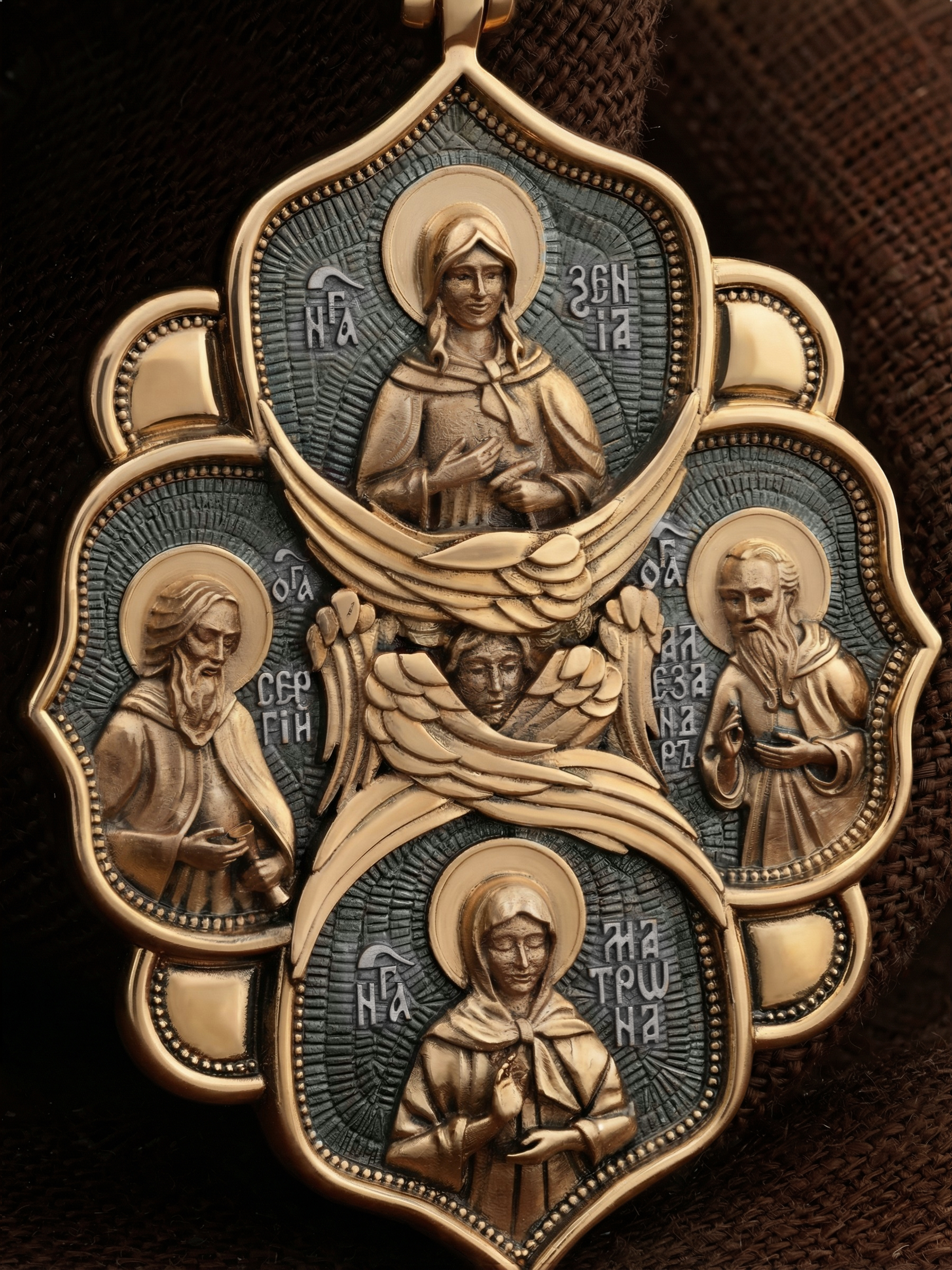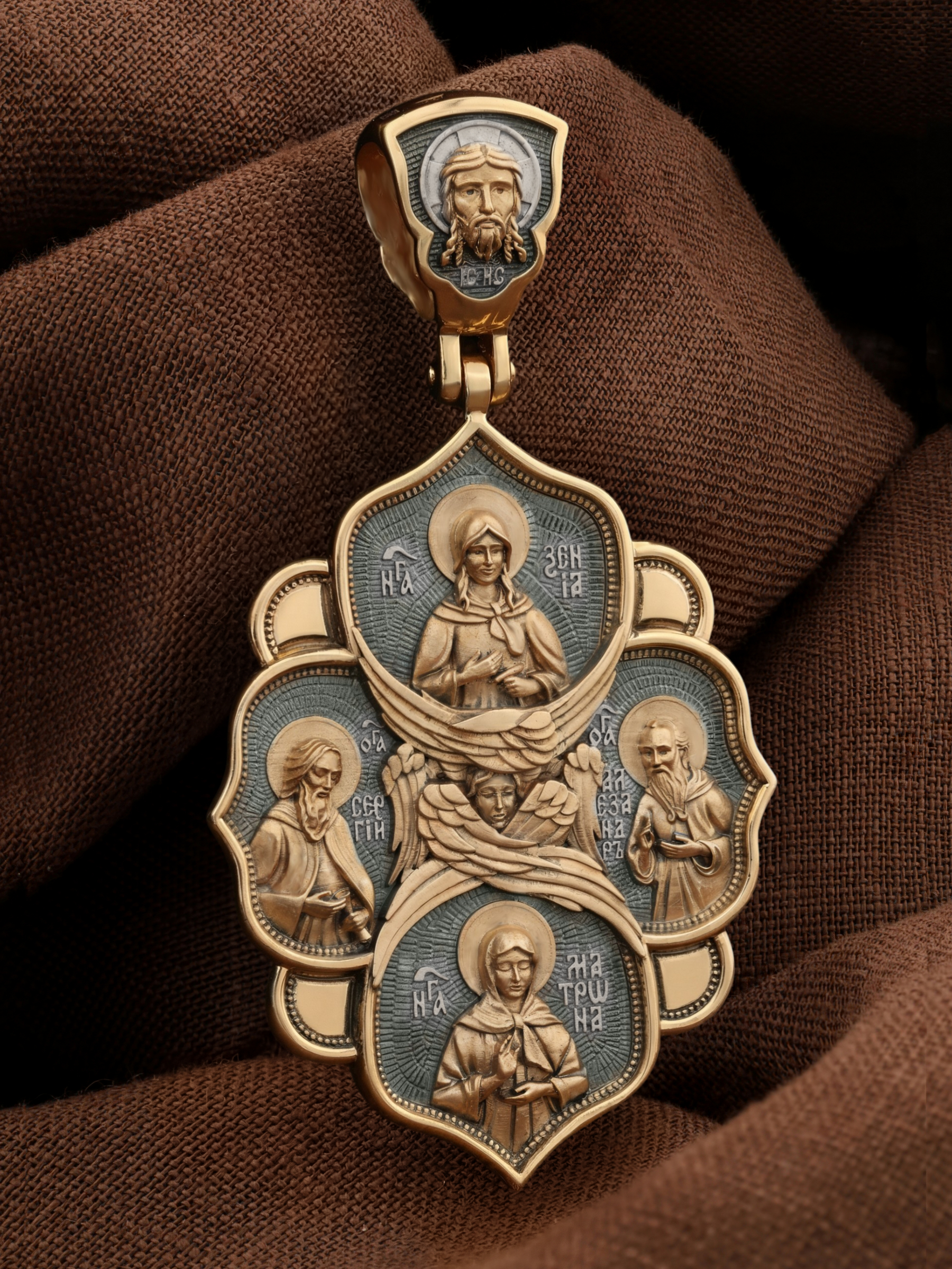 Справа от Серафима изображен преподобный. Александр Свирский. Преподобный Александр Свирский — великий русский святой. Прославился многими чудесами, и один из немногих святых сподобился явления Святой Троицы. Вверху образка изображена блаженная Ксения Петербургская Она прославилась своим подвигом юродства ради Христа. Святая почитается как скорая помощница в устроении семейного счастья, помогает при болезнях детей и близких.