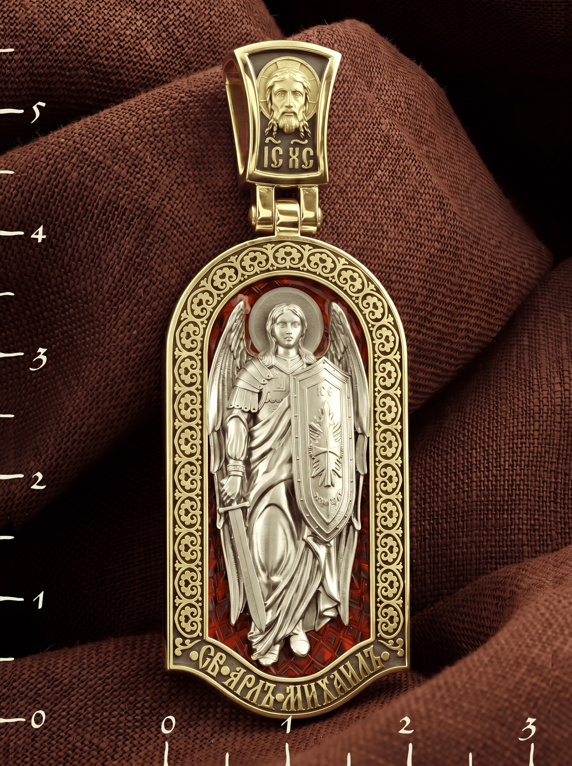 Основой композиции лицевой стороны является ростовое изображение Архангела Михаила — Архистратига всех Небесных Воинств. Он ведет непримиримую войну против сил зла, охраняет райские врата и защищает души людей. Его имя означает «Кто яко Бог?», так как он самый могучий и грозный враг зла. Он первым ополчился на Денницу, когда тот восстал против Бога, низверг его с Неба и не перестает сражаться с его темным воинством. Поэтому он часто изображается в виде воина, в доспехах и с огненным мечом. Но как служитель Небесного Царя и глава Ангелов и Архангелов на многих иконах он предстает в богатой одежде византийских придворных.