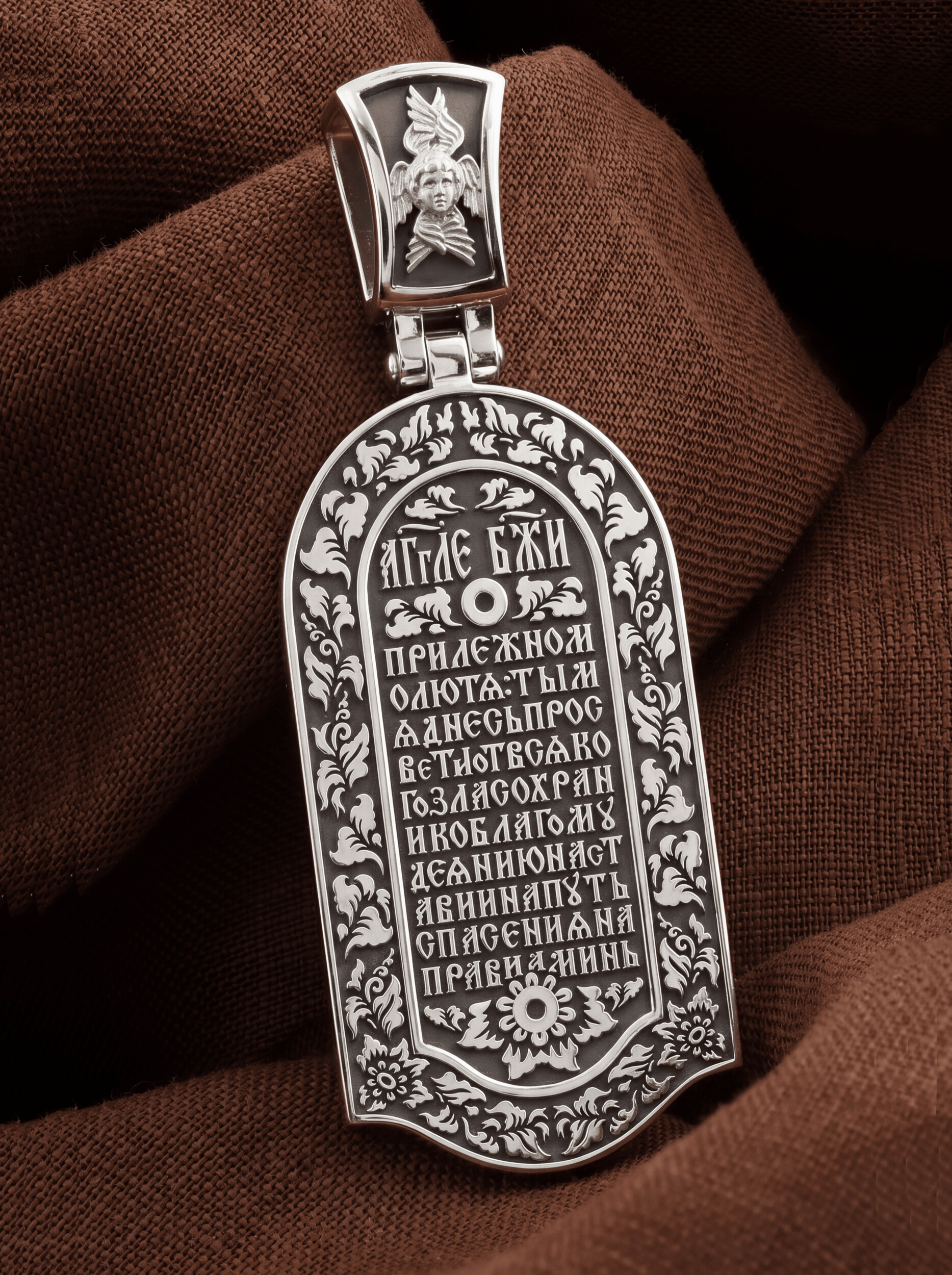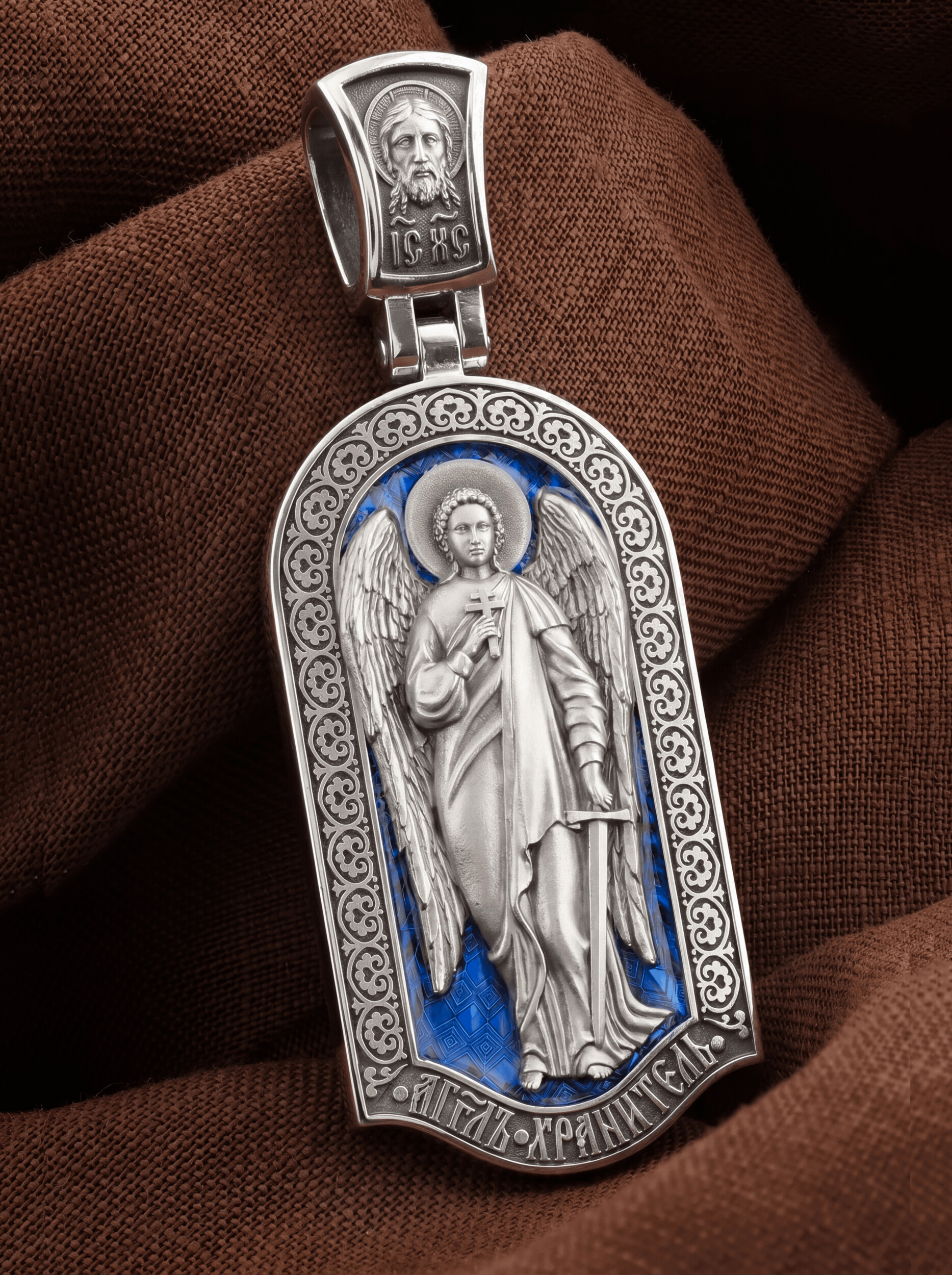 Основой композиции лицевой стороны является Ангела Хранителя. Образок Ангел Хранитель — это не просто украшение, а настоящая миниатюрная икона. В руках Ангел держит традиционные символические атрибуты Ангелов Хранителей: крест — знак послушания Христу и следования Его заповедям, меч — символ непримиримой борьбы, которую он ведет с бесами, отражая их нападения на людей. Слово «ангел» означает «вестник». Ангелы — верные служители Божьи, которых Господь посылает возвещать Свои повеления. Ангелы тварны, как и люди, но имеют другую природу. На иконах они изображаются в человеческом обличье с большими крыльями. Могучие крылья ангелов символизируют быстроту, с которой они исполняют повеления Бога, а небольшие ленточки у ушей –тороки, или слухи — показывают, что они всегда слышат Его голос.