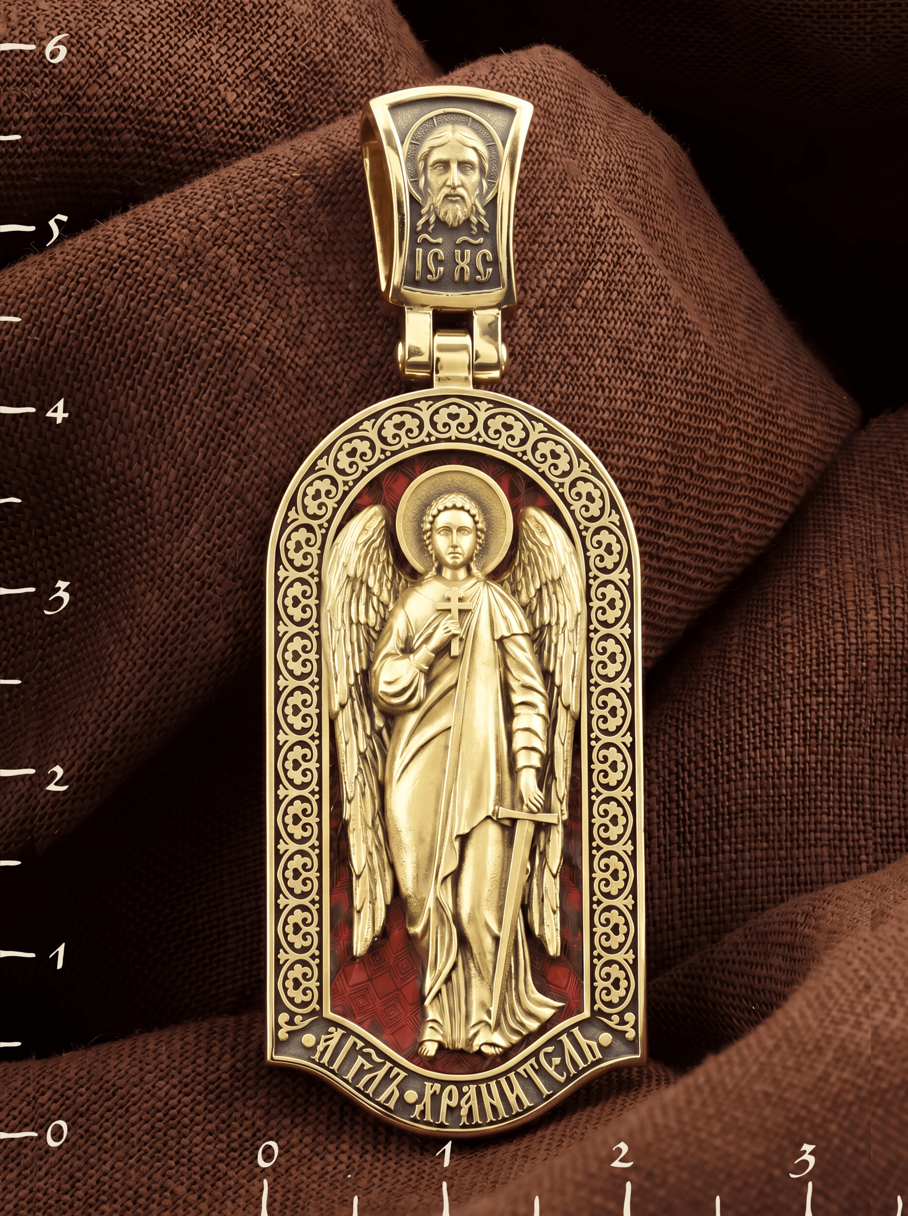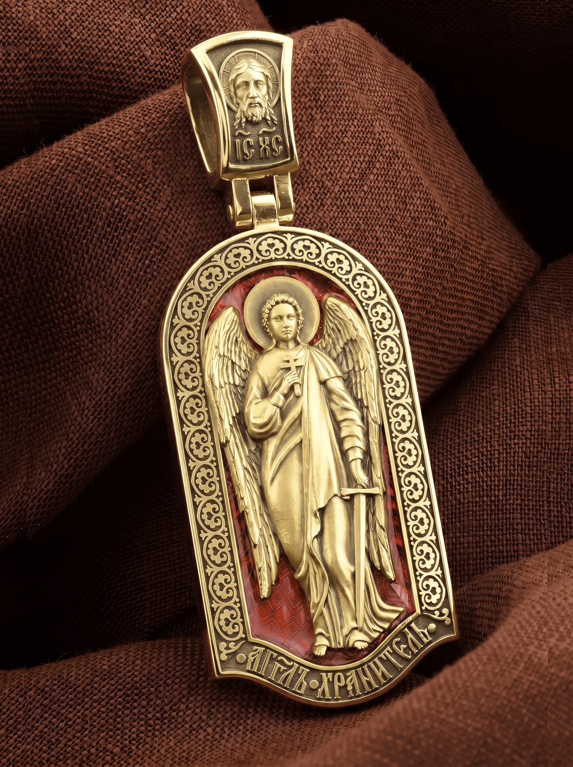 Основой композиции лицевой стороны является Ангела Хранителя. Образок Ангел Хранитель — это не просто украшение, а настоящая миниатюрная икона. В руках Ангел держит традиционные символические атрибуты Ангелов Хранителей: крест — знак послушания Христу и следования Его заповедям, меч — символ непримиримой борьбы, которую он ведет с бесами, отражая их нападения на людей. Слово «ангел» означает «вестник». Ангелы — верные служители Божьи, которых Господь посылает возвещать Свои повеления. Ангелы тварны, как и люди, но имеют другую природу. На иконах они изображаются в человеческом обличье с большими крыльями. Могучие крылья ангелов символизируют быстроту, с которой они исполняют повеления Бога, а небольшие ленточки у ушей –тороки, или слухи — показывают, что они всегда слышат Его голос.
