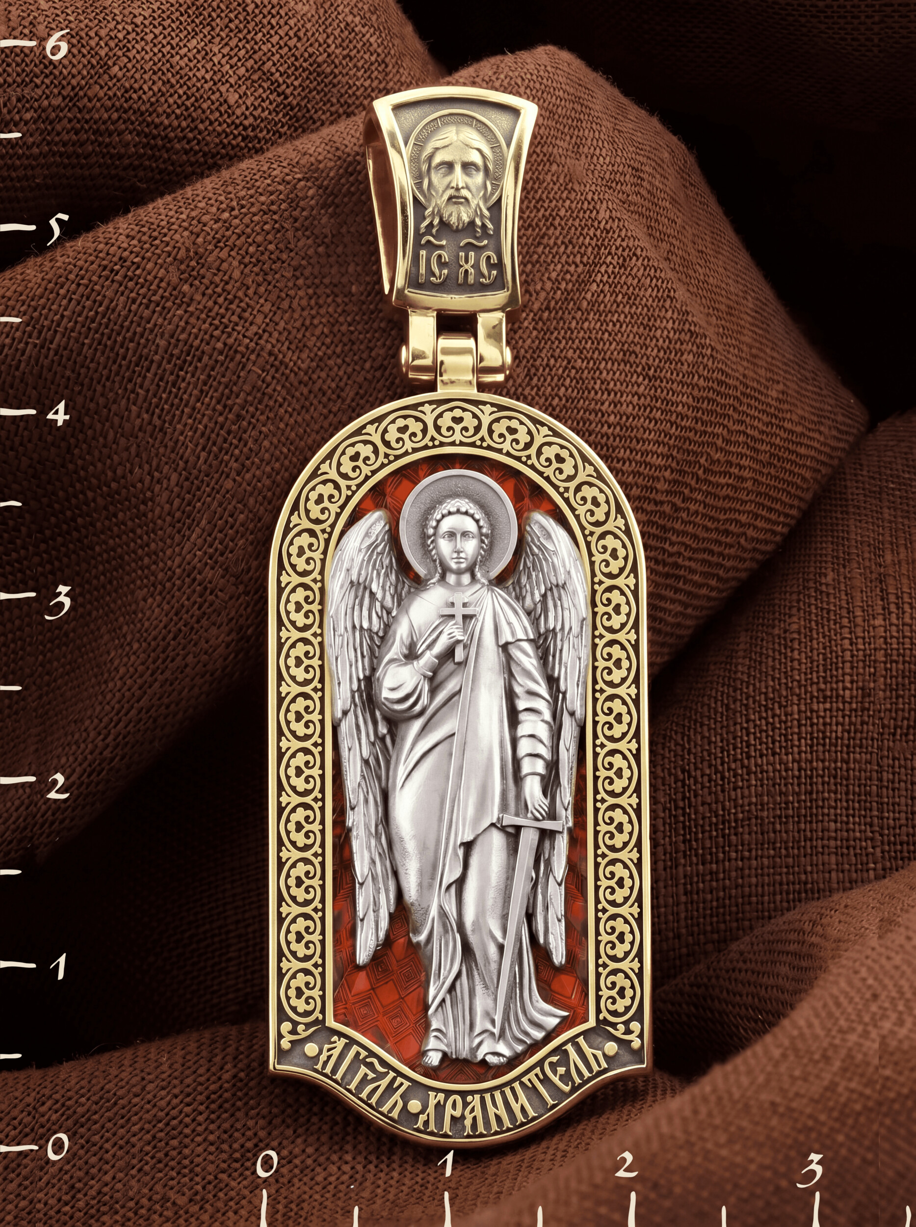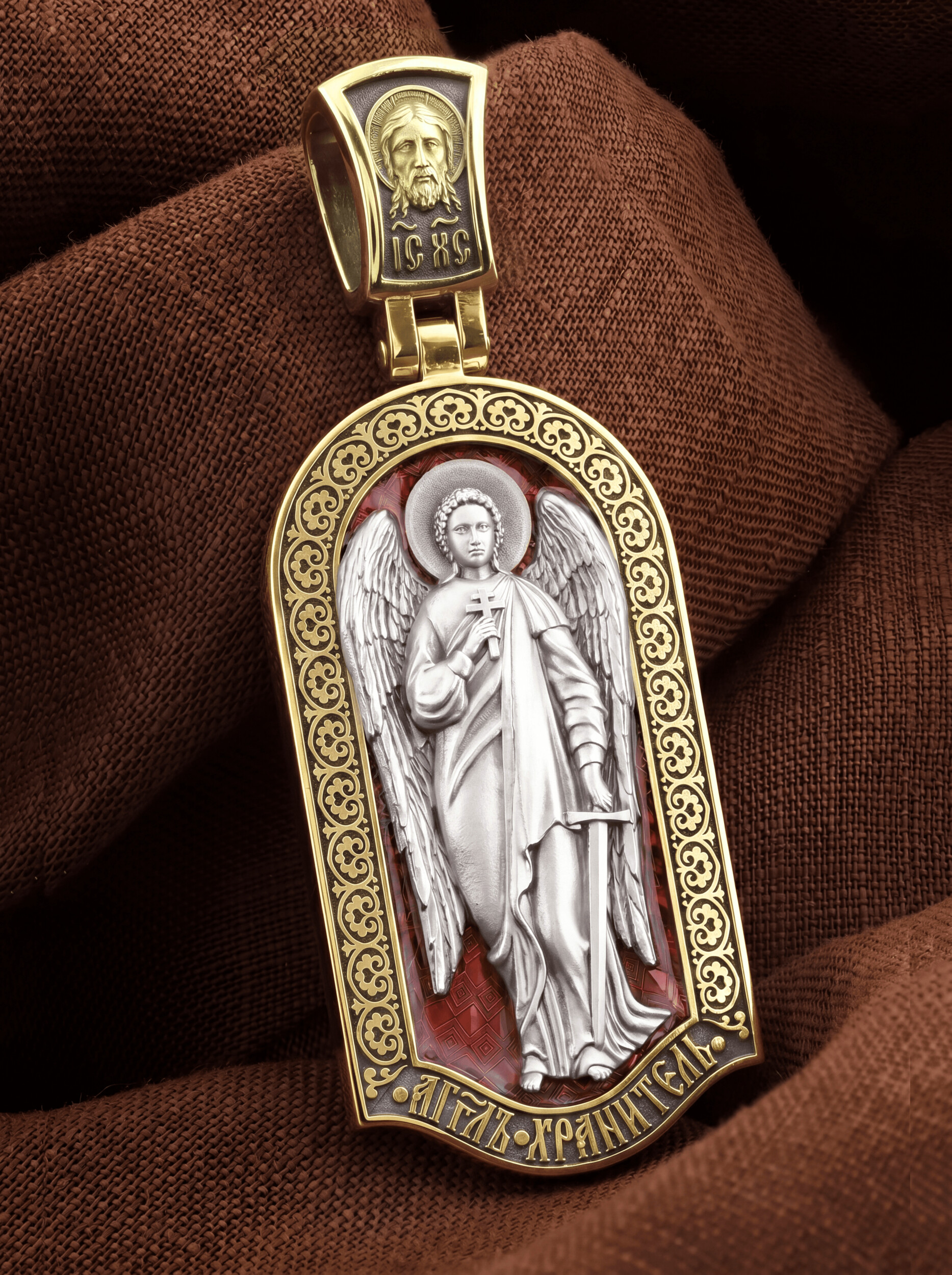 Основой композиции лицевой стороны является Ангела Хранителя. Образок Ангел Хранитель — это не просто украшение, а настоящая миниатюрная икона. В руках Ангел держит традиционные символические атрибуты Ангелов Хранителей: крест — знак послушания Христу и следования Его заповедям, меч — символ непримиримой борьбы, которую он ведет с бесами, отражая их нападения на людей. Слово «ангел» означает «вестник». Ангелы — верные служители Божьи, которых Господь посылает возвещать Свои повеления. Ангелы тварны, как и люди, но имеют другую природу. На иконах они изображаются в человеческом обличье с большими крыльями. Могучие крылья ангелов символизируют быстроту, с которой они исполняют повеления Бога, а небольшие ленточки у ушей –тороки, или слухи — показывают, что они всегда слышат Его голос.