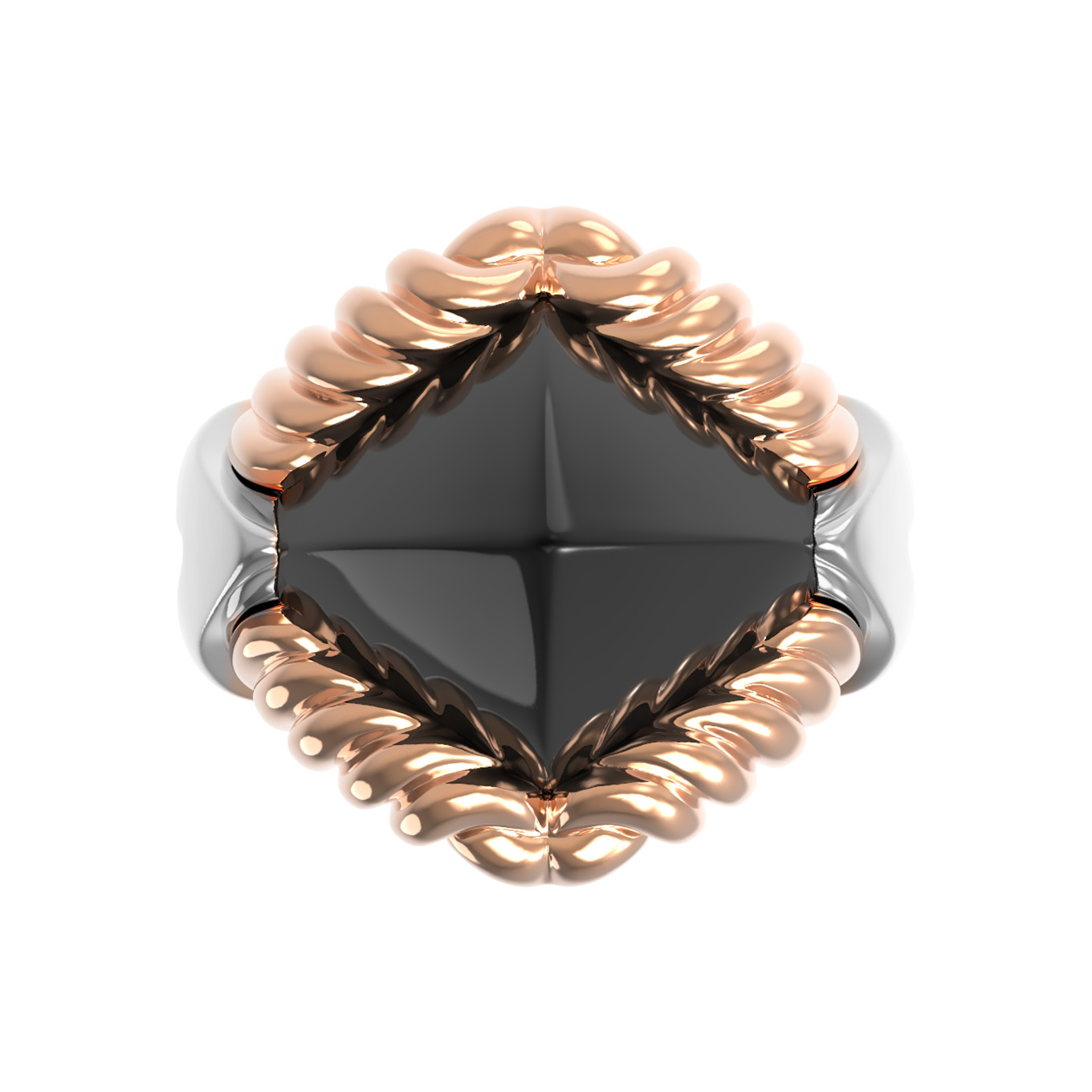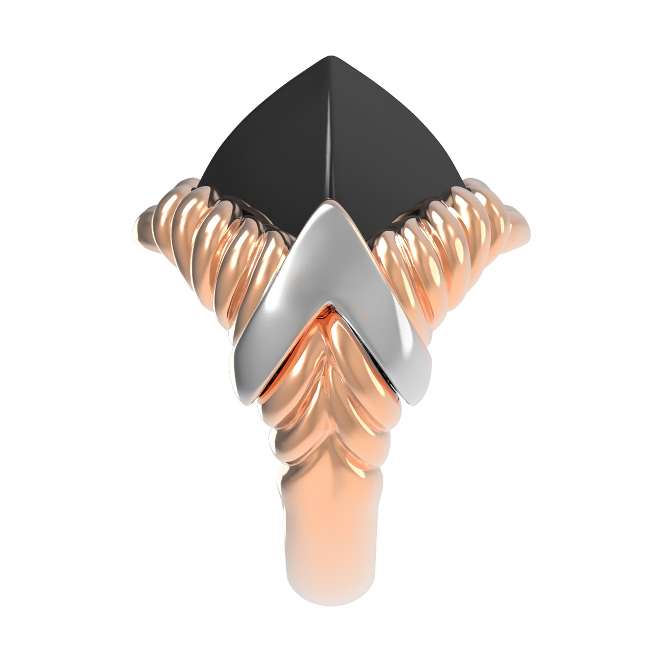 Изысканное кольцо из красного золота 585 пробы — это воплощение лаконичности и строгого стиля. Украшение входит в коллекцию De Luxe — Геометрия, которая делает ставку на четкие линии и продуманный дизайн. Центральным элементом изделия является вставка из оникса глубокого черного цвета. Выверенная форма вставки — ромб — придает украшению архитектурную выразительность, подчеркивая статус и безупречный вкус владельца.