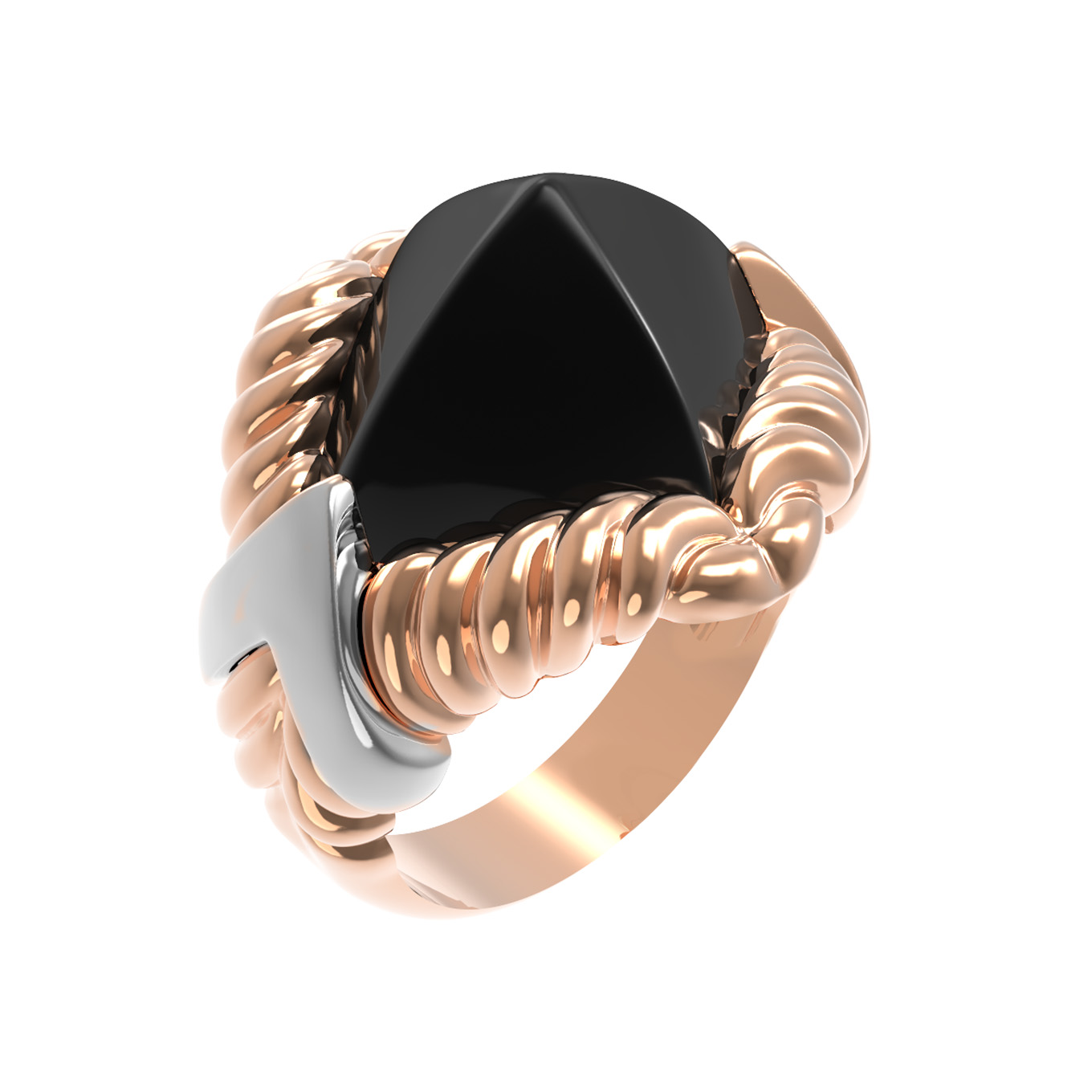 Массивный и фактурный ободок кольца гармонично сочетается с геометрически правильным ониксом, создавая баланс между классическими ювелирными традициями и современными трендами. Качественное красное золото 585 пробы обеспечивает долговечность и благородный блеск. Это универсальный аксессуар, который подойдет как для мужчин, так и для женщин, предпочитающих выразительные украшения с характером.