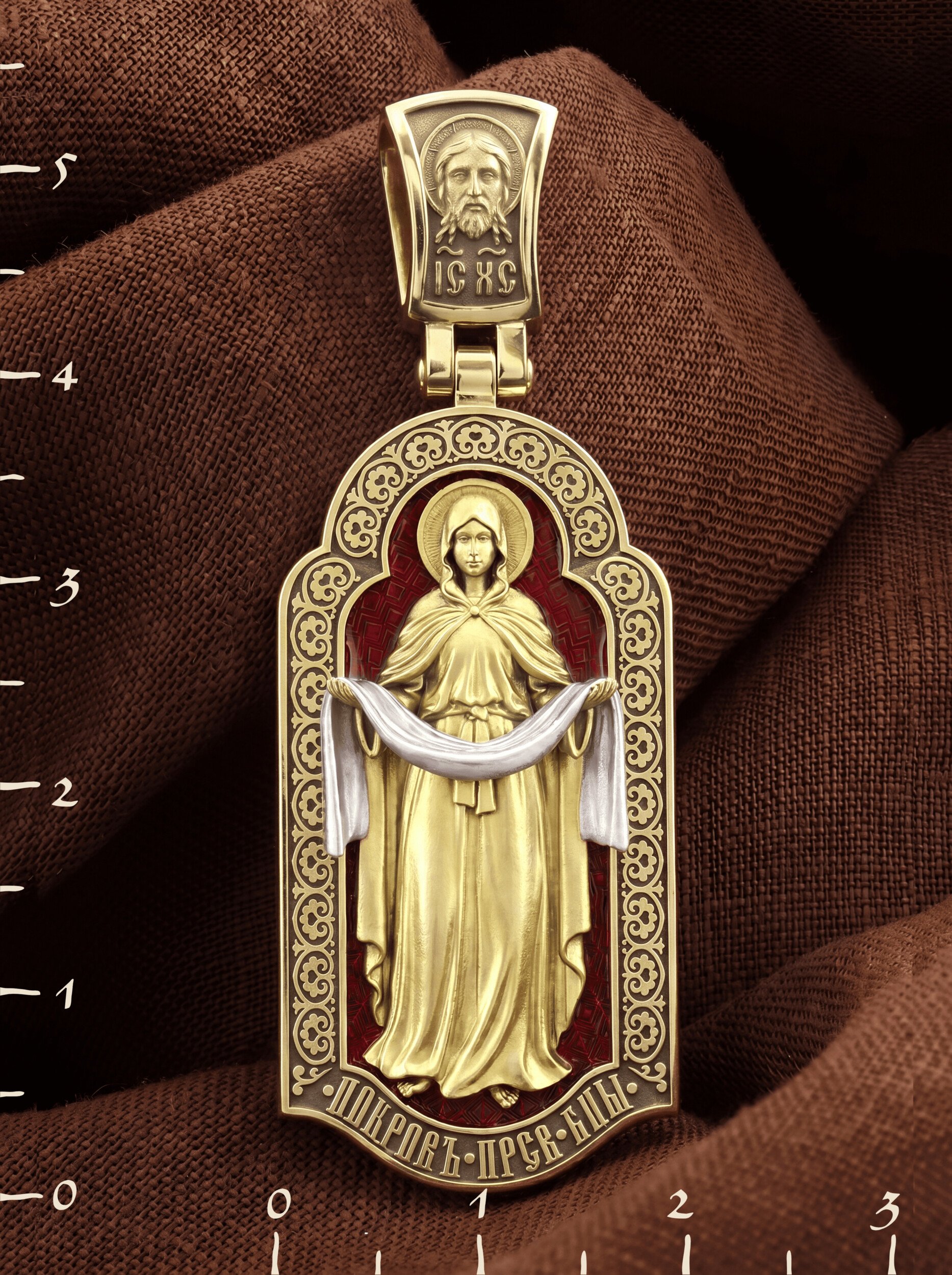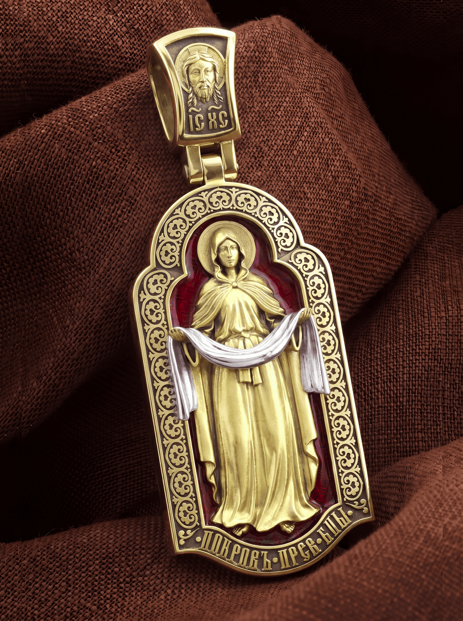 На лицевой части образка изображена икона Покров Пресвятой Богородицы. Праздник Покрова Божией Матери является воспоминанием чуда, которое произошло во Влахнернской церкви 1 (14) октября 910 года: Пресвятая Богородица явилась верующим над алтарем храма и распростерла над ними Свое покрывало. В этот день Божья Матерь открыла людям, что Она является Ходатаицей за них перед Богом. Богородица простирает Свой молитвенный покров над всеми православными христианами и умоляет Сына Своего о даровании вечного спасения каждому человеку.