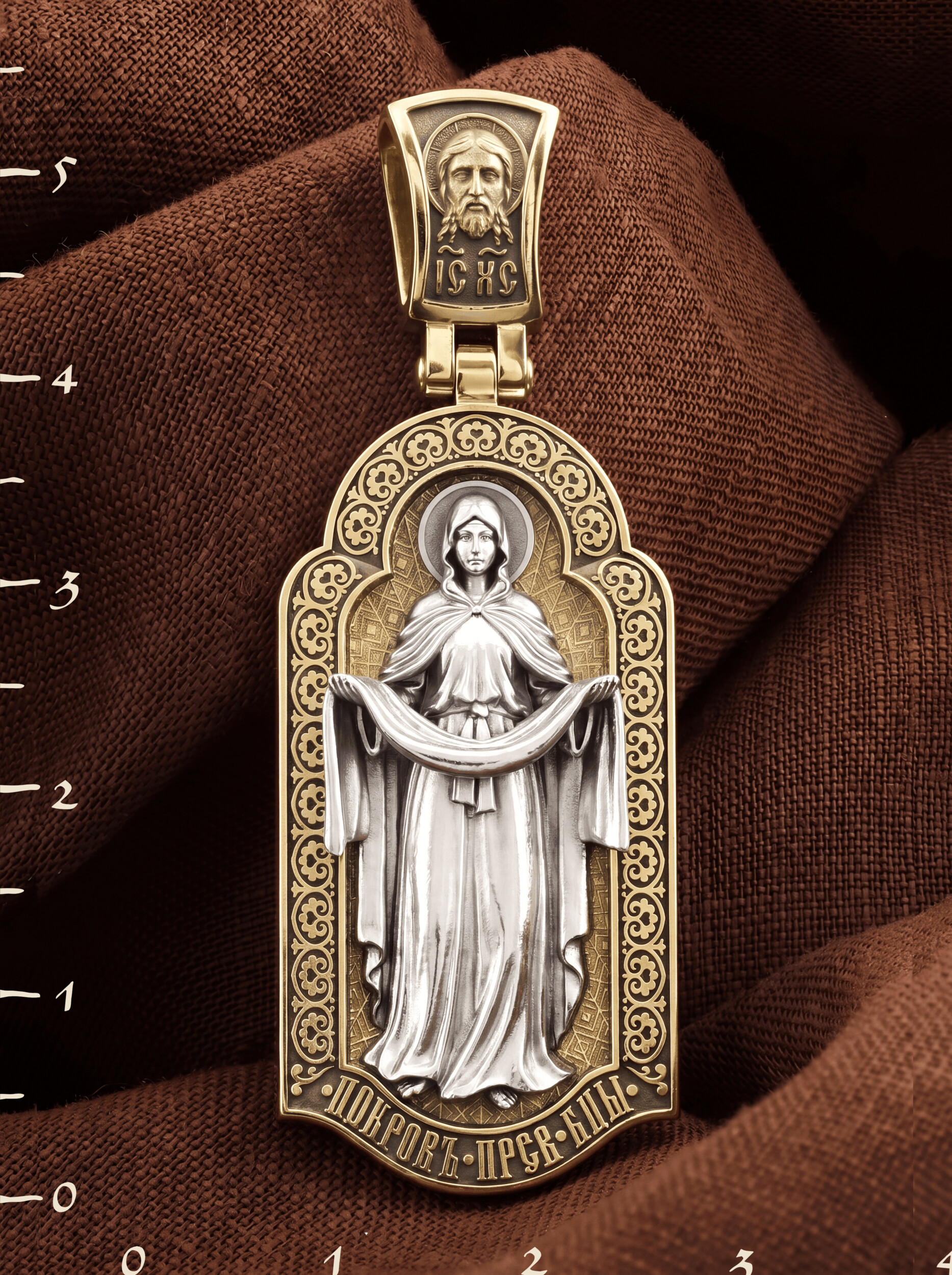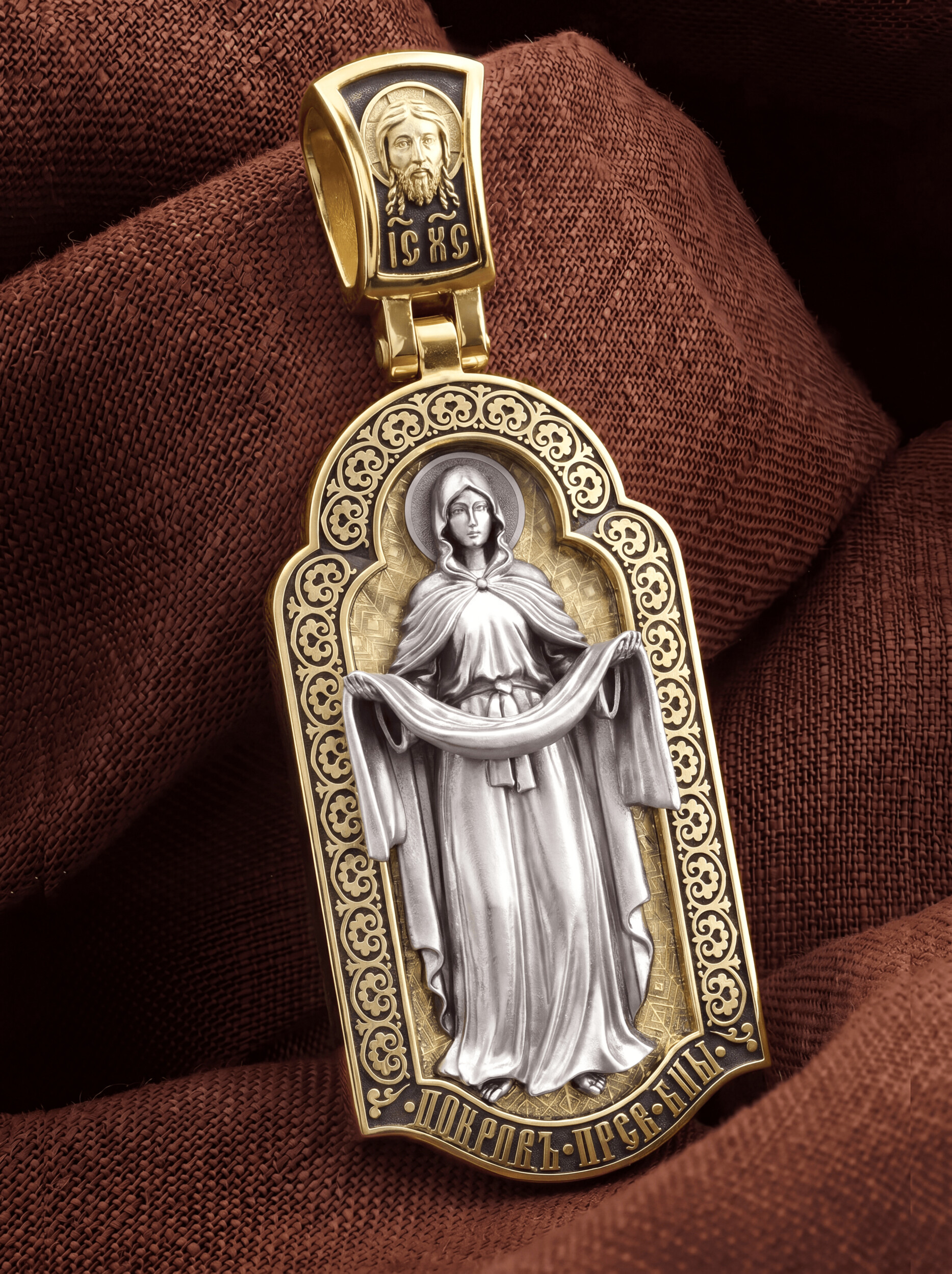 На лицевой части образка изображена икона Покров Пресвятой Богородицы. Праздник Покрова Божией Матери является воспоминанием чуда, которое произошло во Влахнернской церкви 1 (14) октября 910 года: Пресвятая Богородица явилась верующим над алтарем храма и распростерла над ними Свое покрывало. В этот день Божья Матерь открыла людям, что Она является Ходатаицей за них перед Богом. Богородица простирает Свой молитвенный покров над всеми православными христианами и умоляет Сына Своего о даровании вечного спасения каждому человеку.
