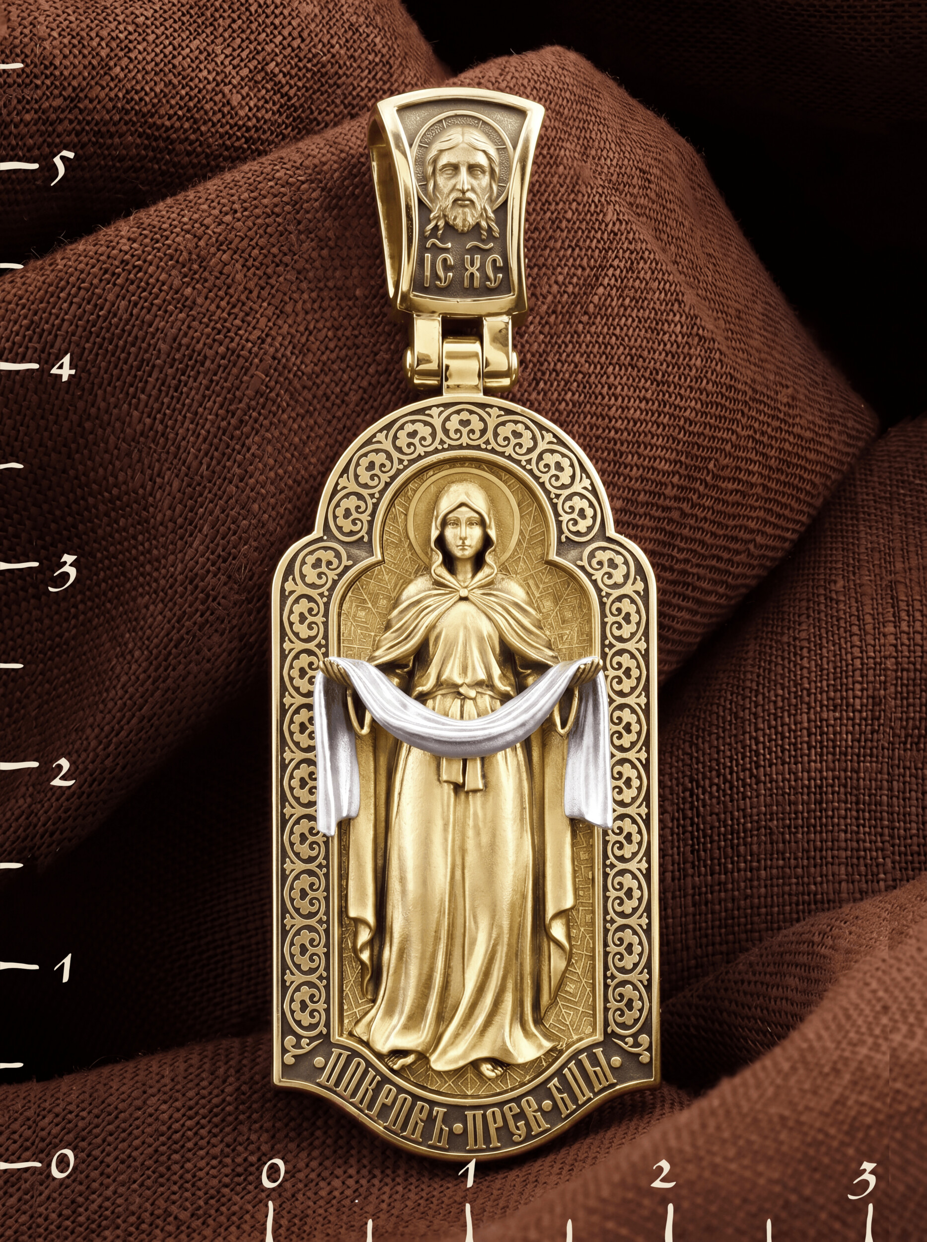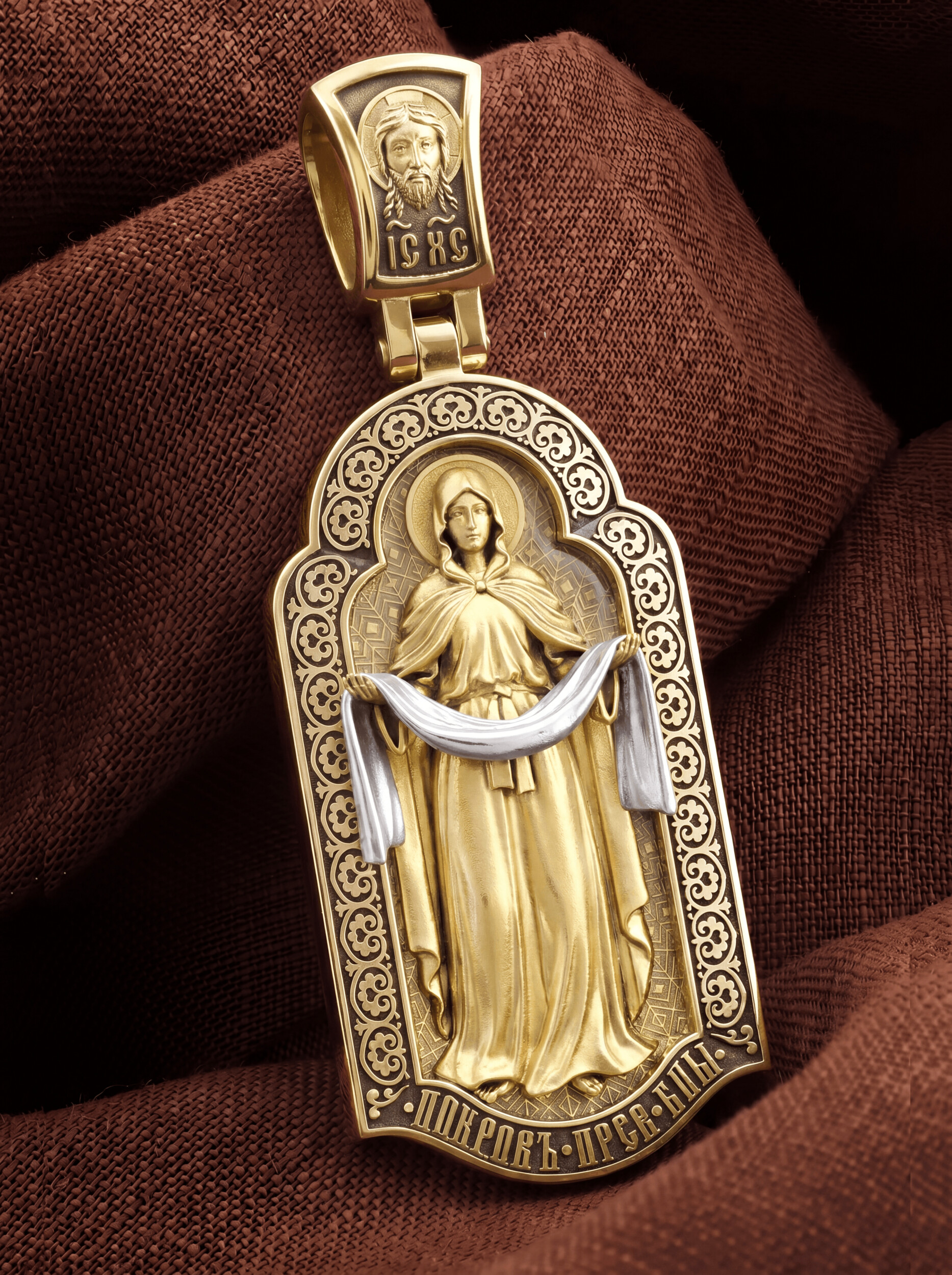 На лицевой части образка изображена икона Покров Пресвятой Богородицы. Праздник Покрова Божией Матери является воспоминанием чуда, которое произошло во Влахнернской церкви 1 (14) октября 910 года: Пресвятая Богородица явилась верующим над алтарем храма и распростерла над ними Свое покрывало. В этот день Божья Матерь открыла людям, что Она является Ходатаицей за них перед Богом. Богородица простирает Свой молитвенный покров над всеми православными христианами и умоляет Сына Своего о даровании вечного спасения каждому человеку.